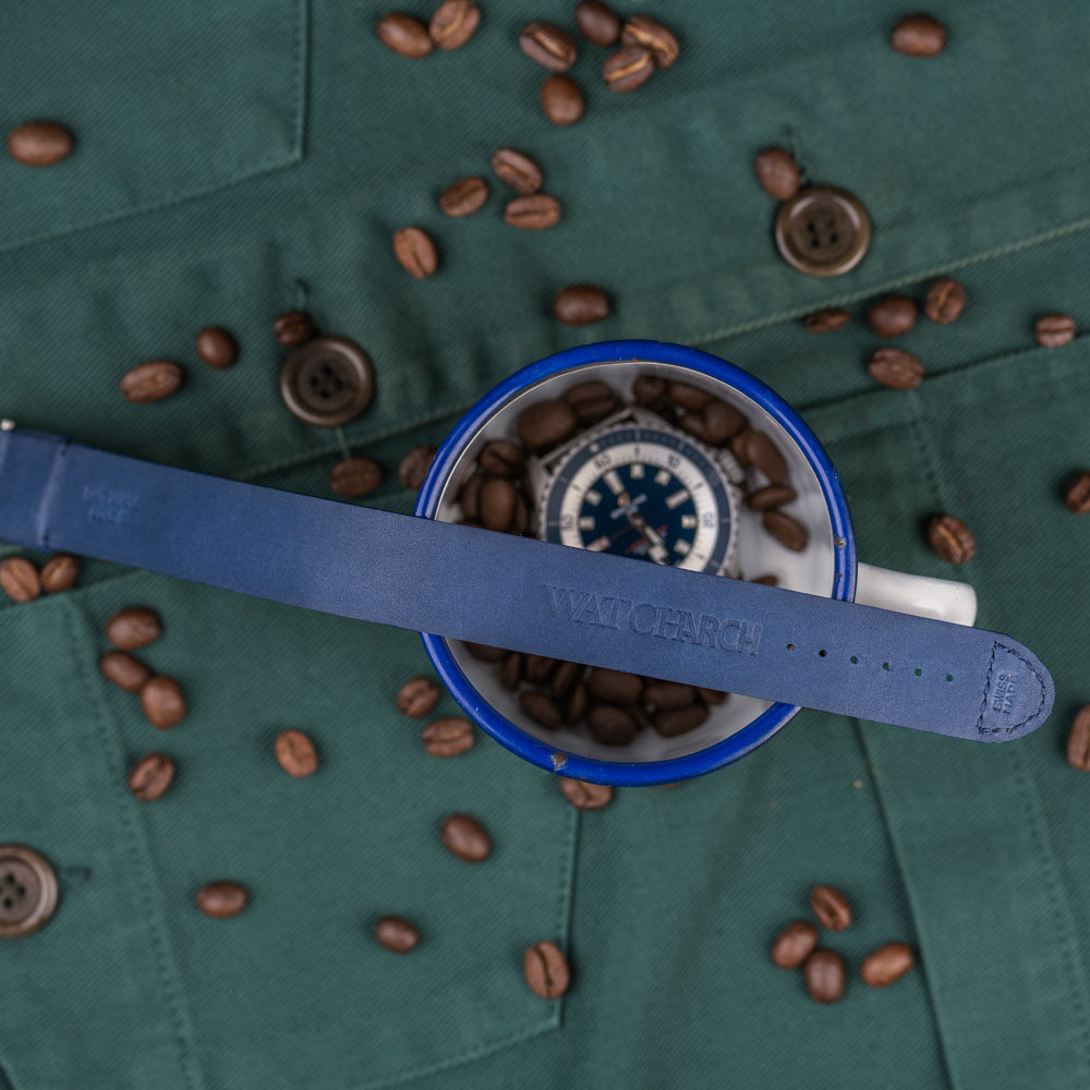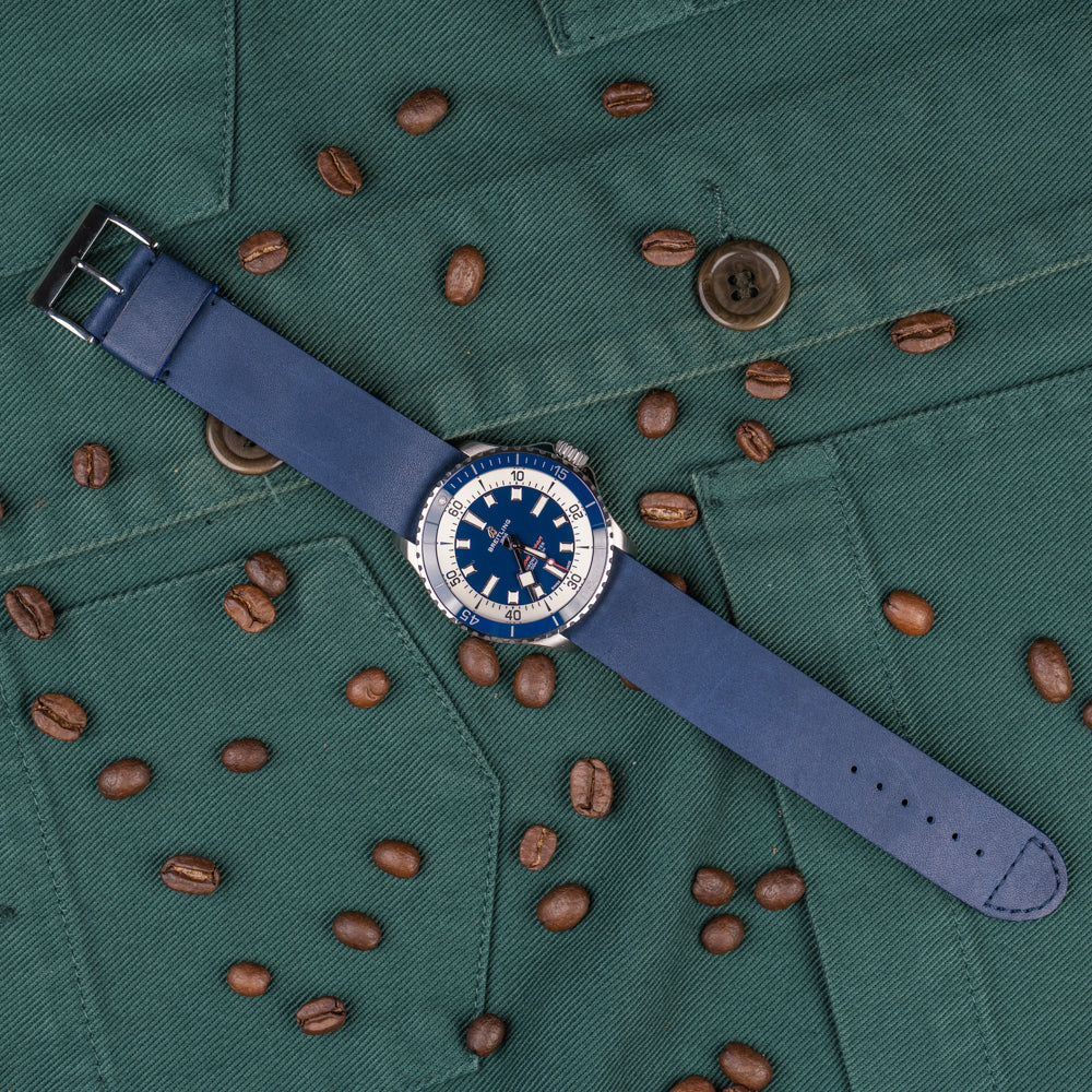 The denim blue color brings that little touch of sportiness and modernity that will go perfectly with your most beautiful tool watch.