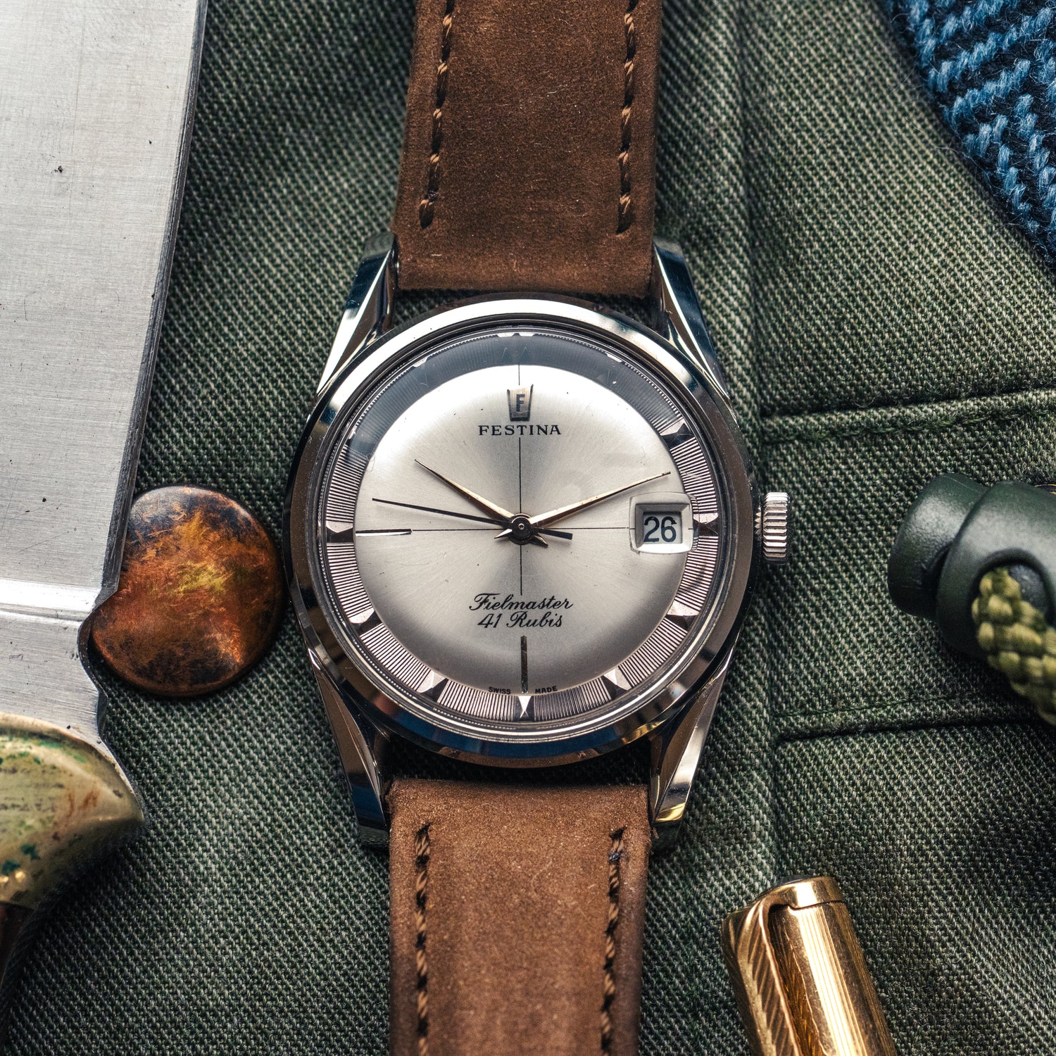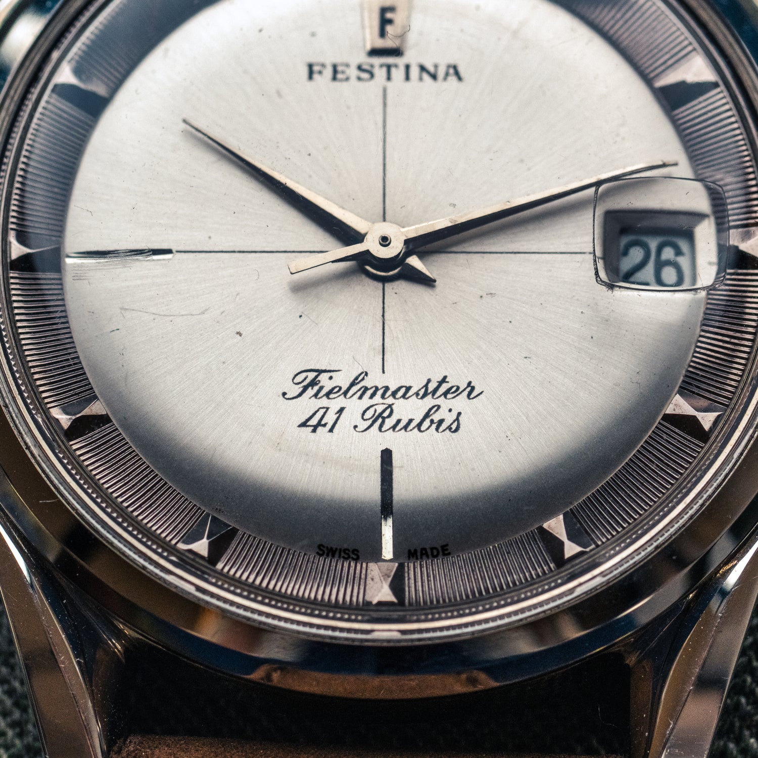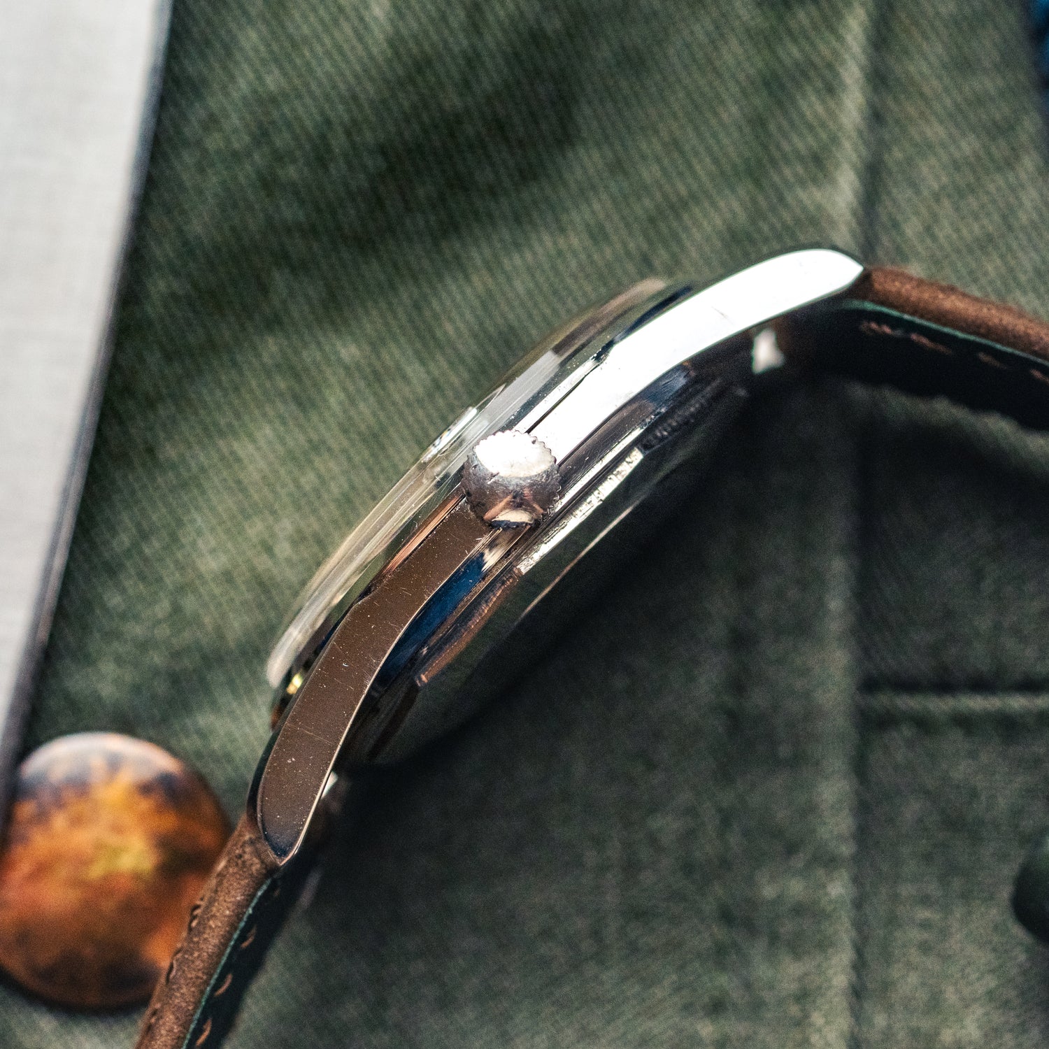 Cette Festina Fieldmaster des années 60 rappelle, à s’y méprendre, la mythique Universal Genève Polerouter. Même équilibre du cadran, même travail sur l’anneau périphérique texturé, mêmes proportions harmonieuses.
