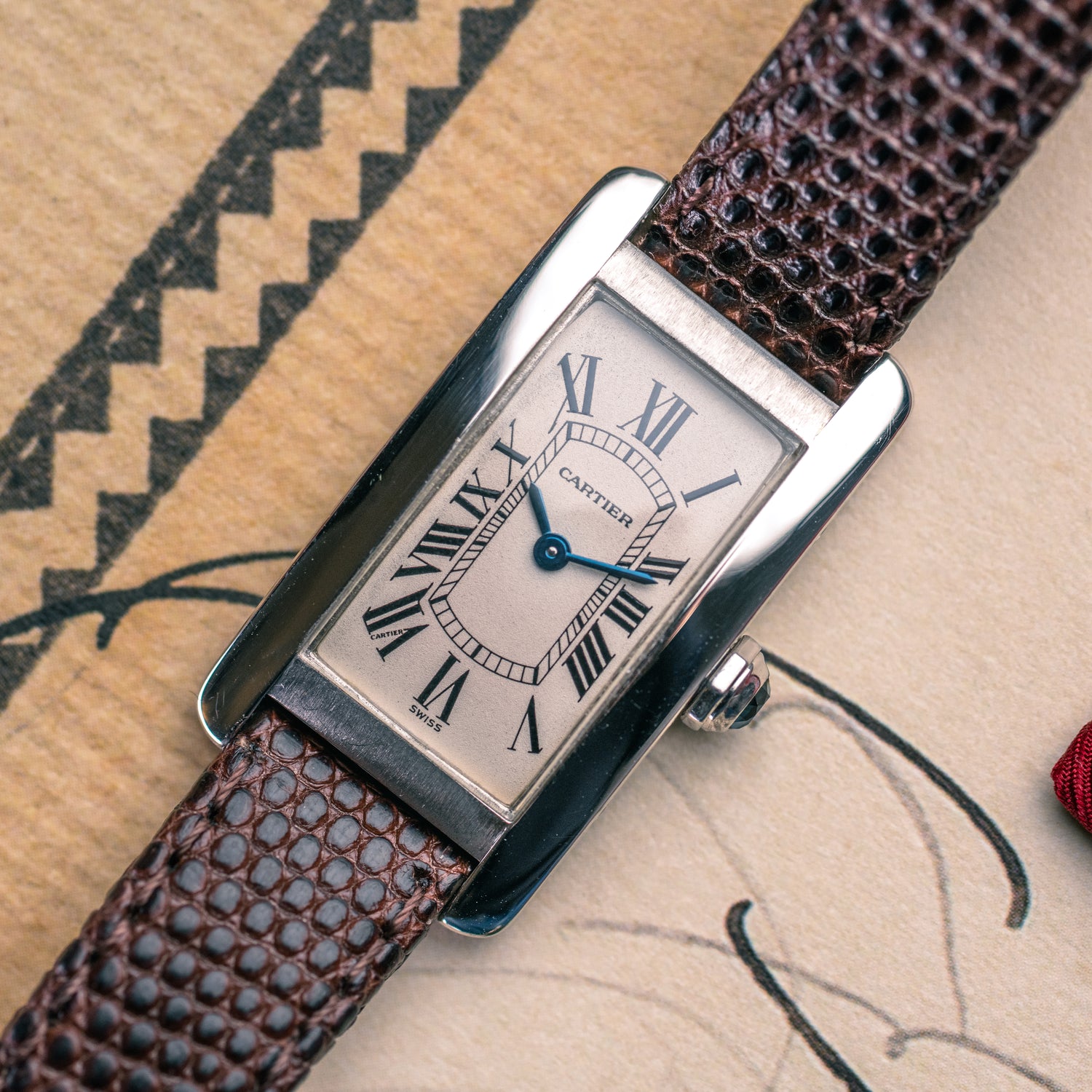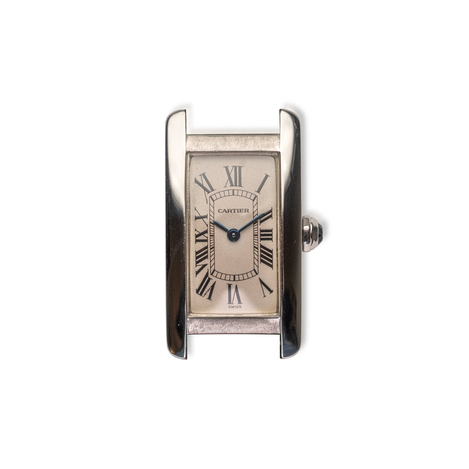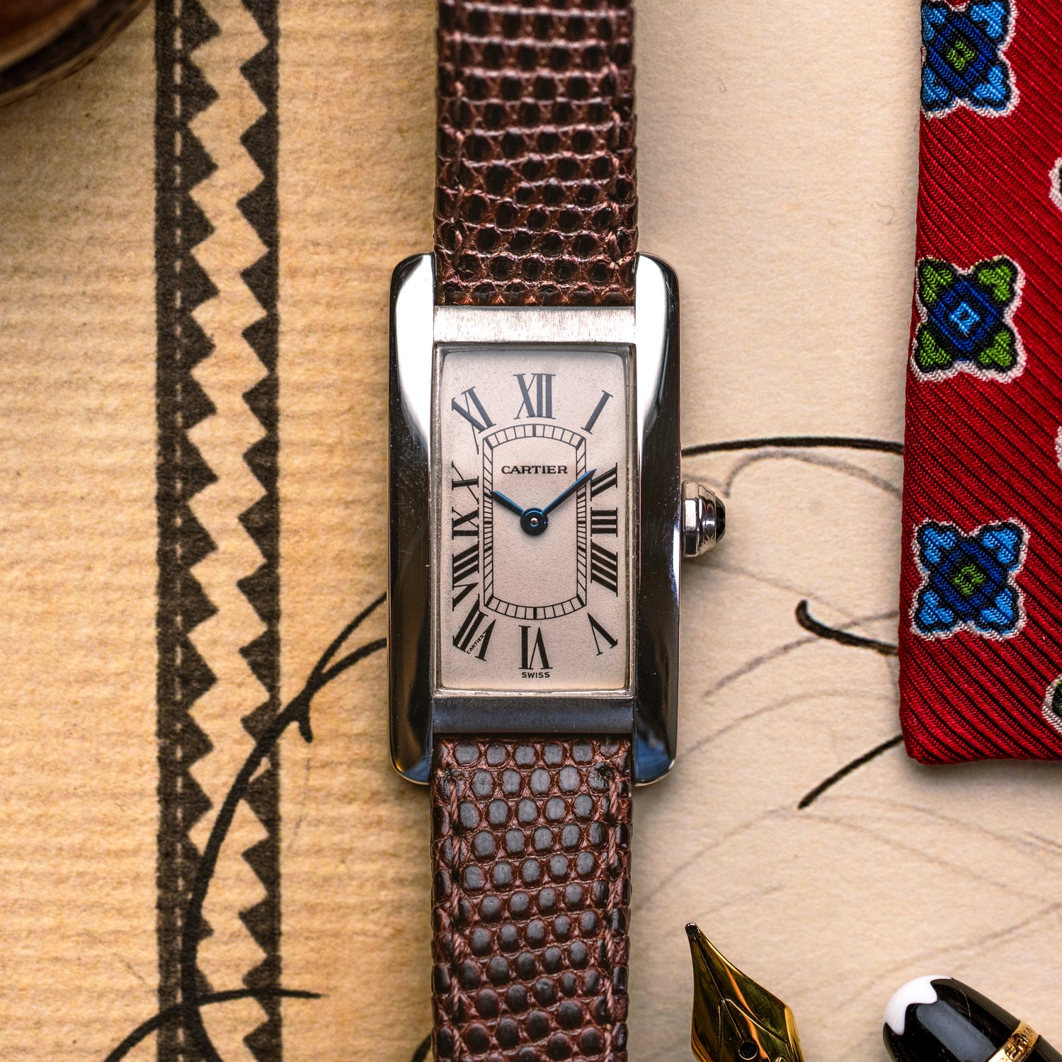La Cartier Tank Américaine, avec son boîtier en or blanc, est l’incarnation du raffinement et de l’élégance à la française.