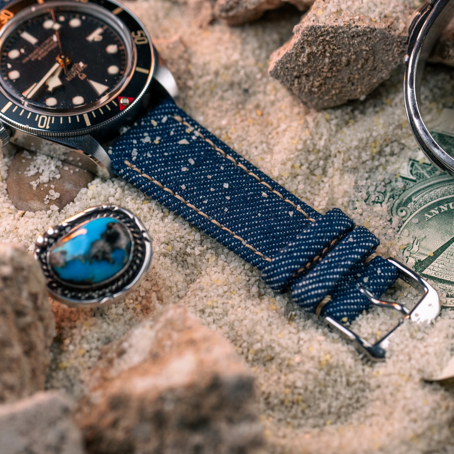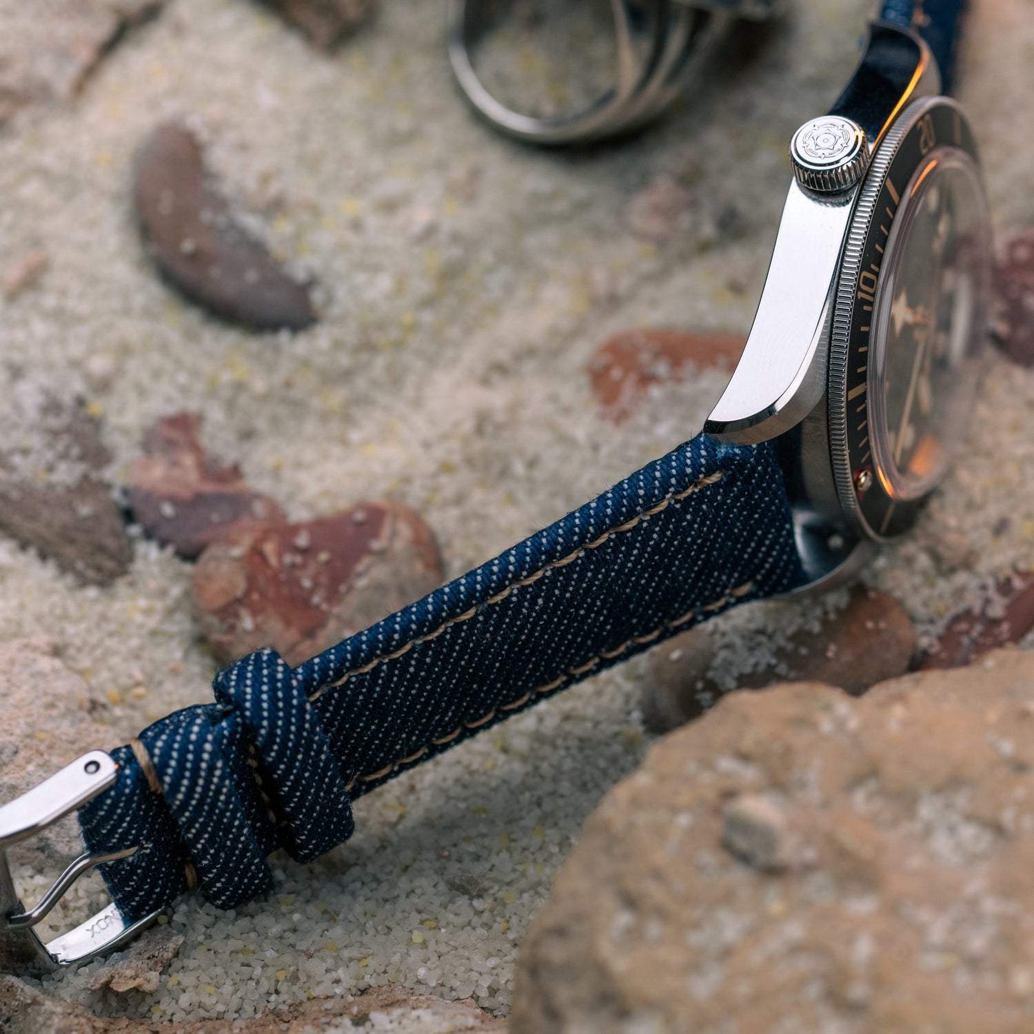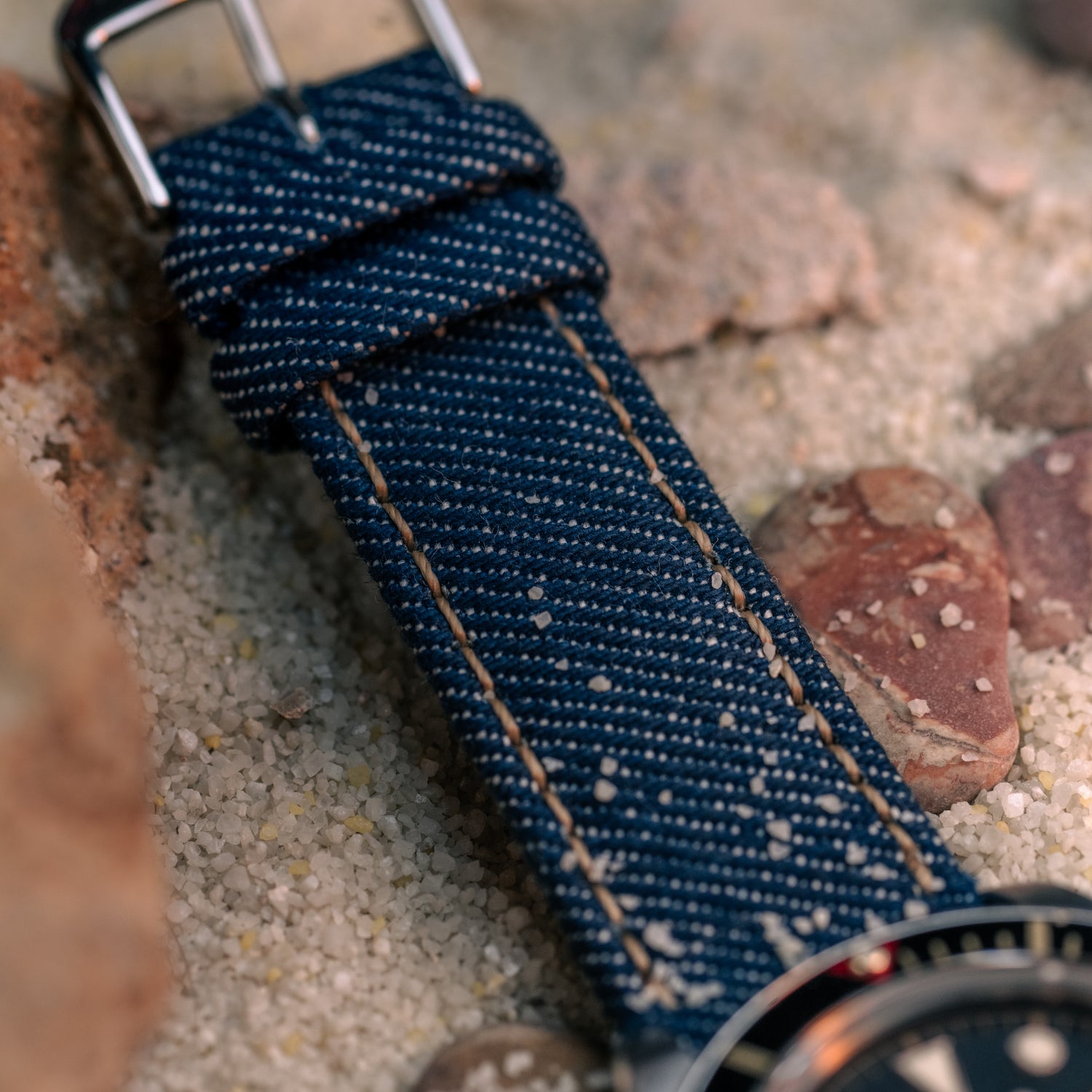 Et pour notre bracelet, le Workwear, nous sommes en collaboration avec un importateur situé à Dresden du nom de Selvadge, qui nous a dégotés lui-même une toile denim venant tout droit du Japon de la célèbre maison KUROKI.