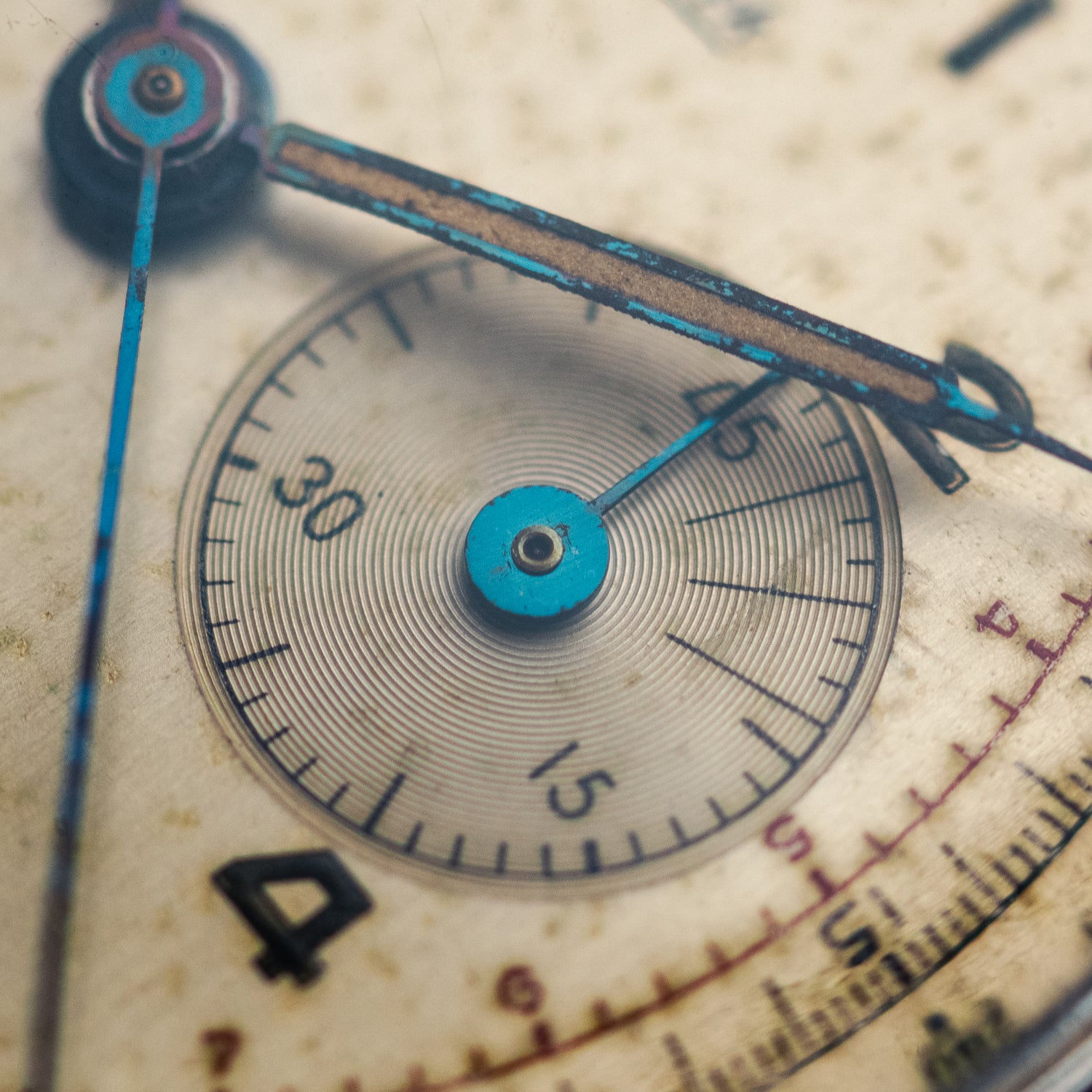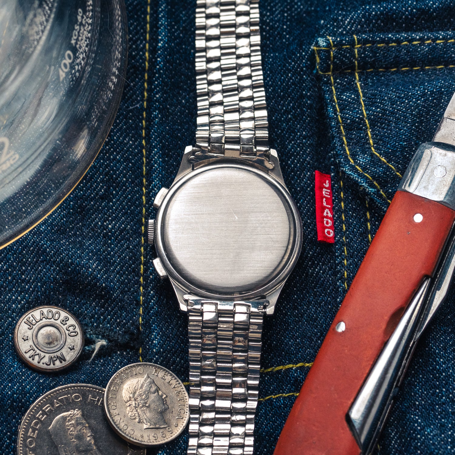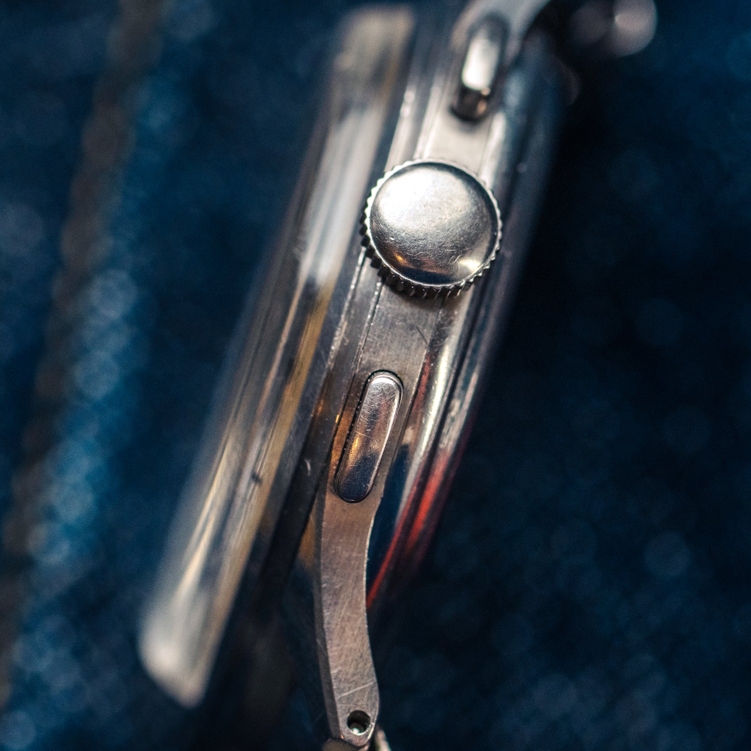 Son cadran crème patiné, subtilement marqué par les décennies, révèle une échelle télémétrique rouge et un tachymètre périphérique d’une finesse remarquable. Les chiffres arabes appliqués apportent du relief, tandis que les aiguilles bleuies soulignent son ADN d’instrument.