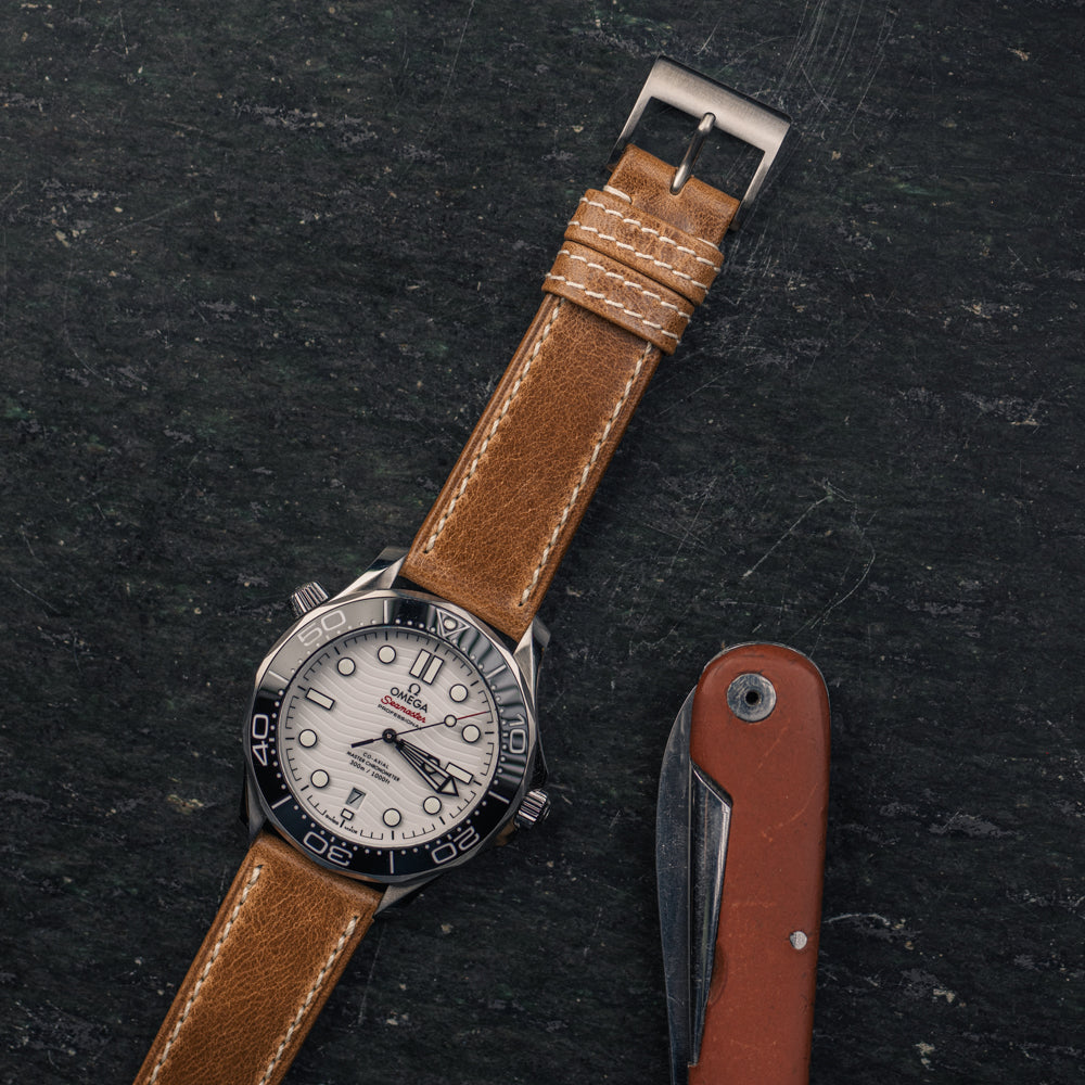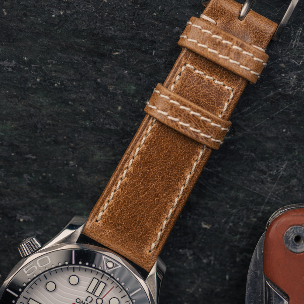 Un cuir de veau au tannage végétal d'une couleur marron moyen offrant des airs de tabacs, on aurait presque envie de le sentir comme on le ferait avec un bon cigare.