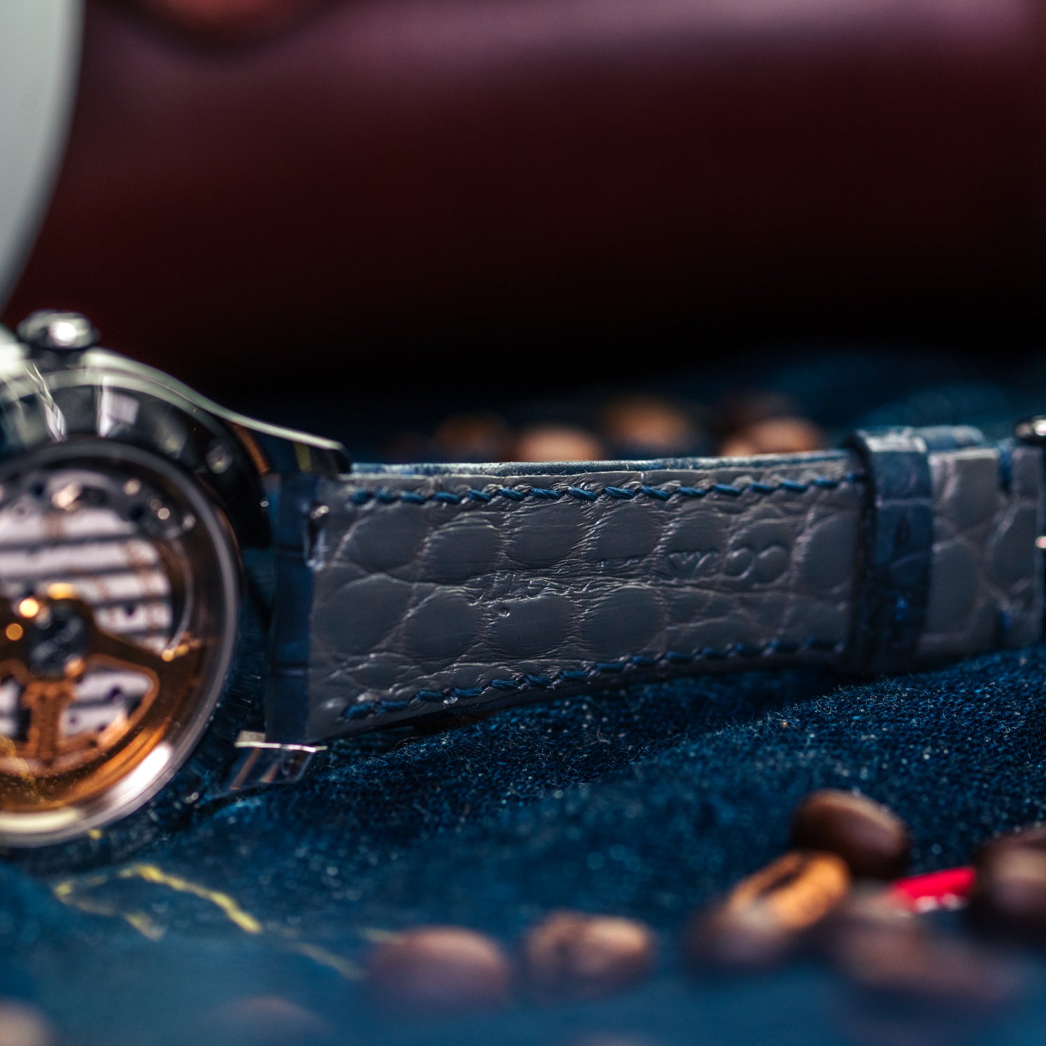 Un jeux de couleur entre la doublure en flanc d'alligator gris anthracite ainsi que la partie supérieur du bracelet bleu indigo.