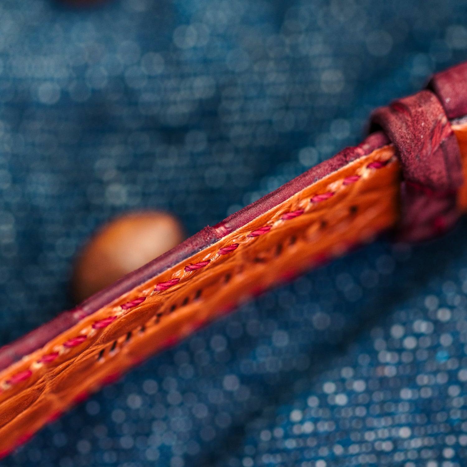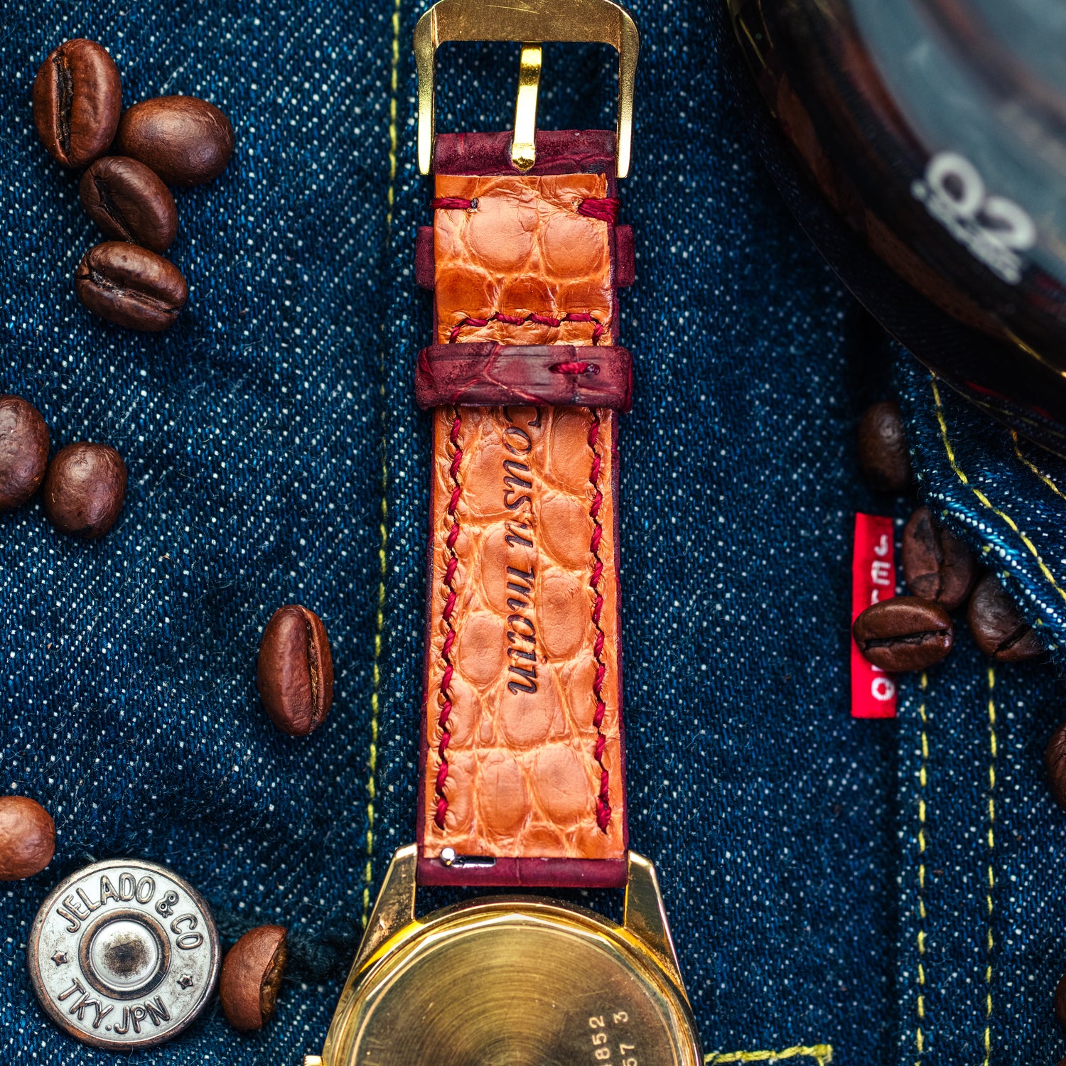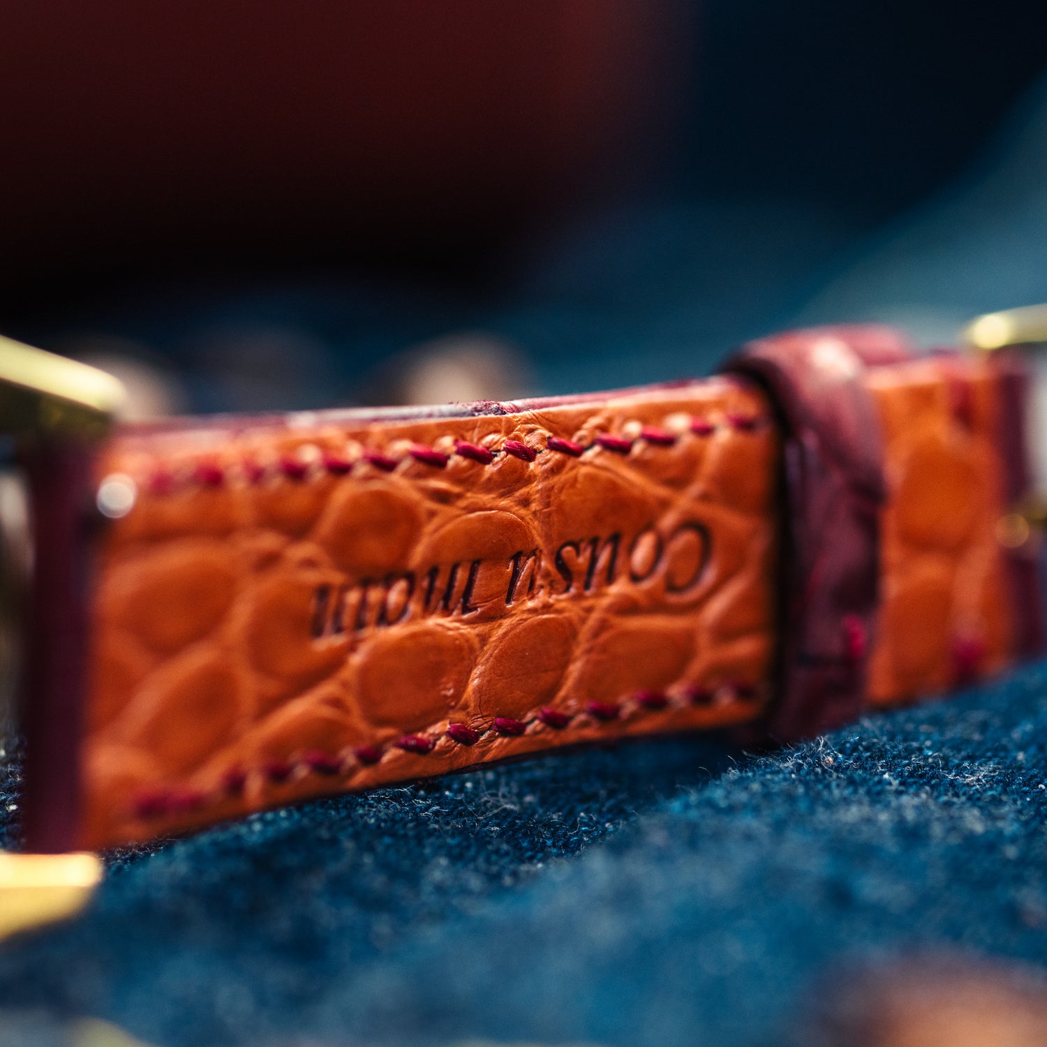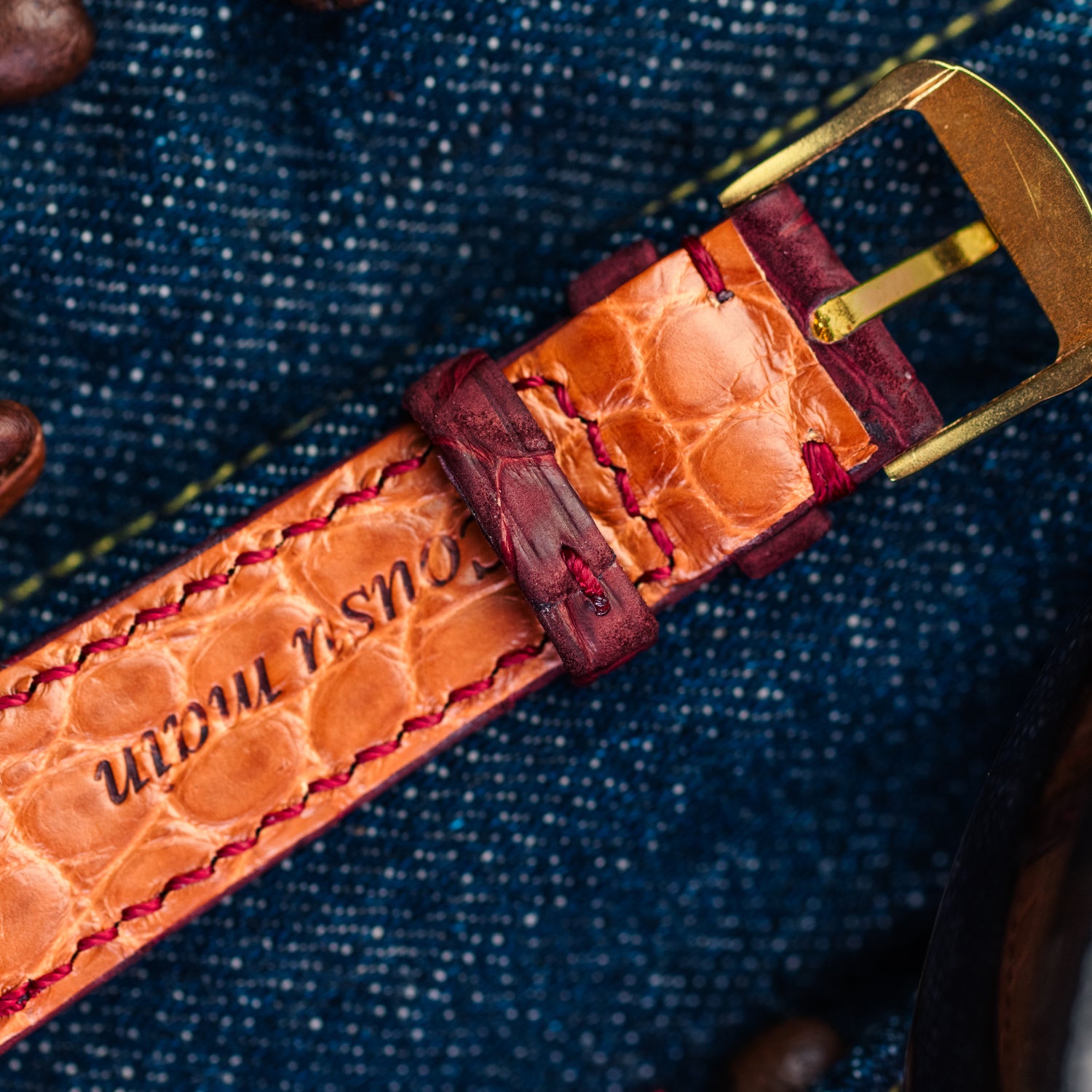 Un jeux de couleur entre la doublure en flanc d'alligator brun golden ainsi que la partie supérieur du bracelet lie de vin.