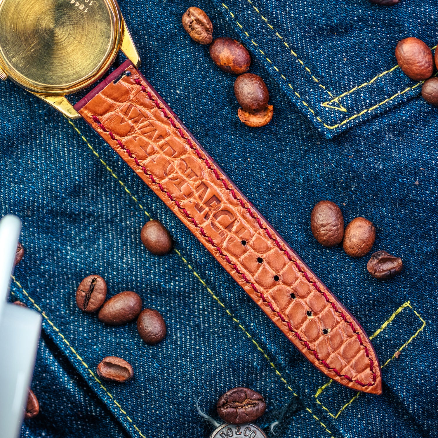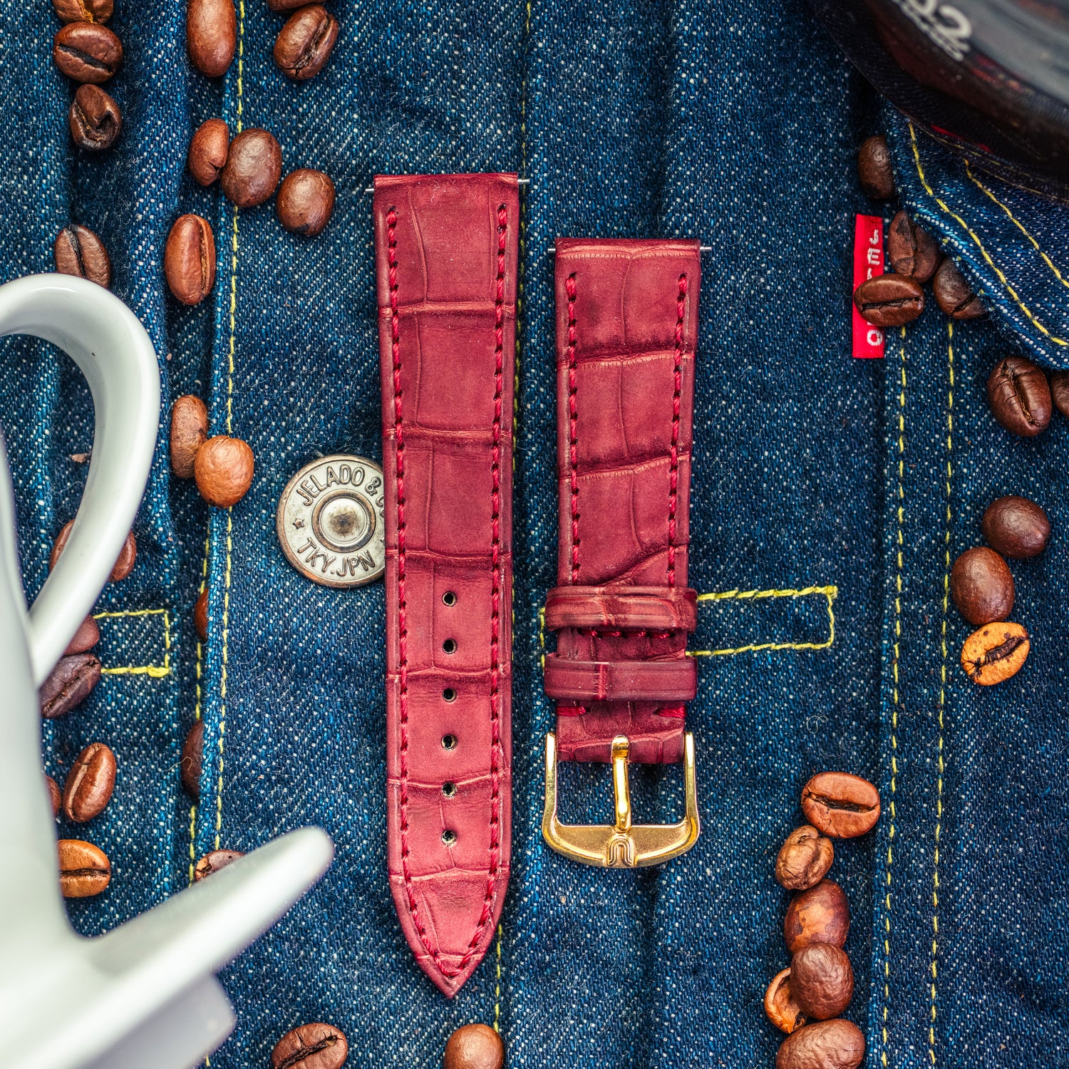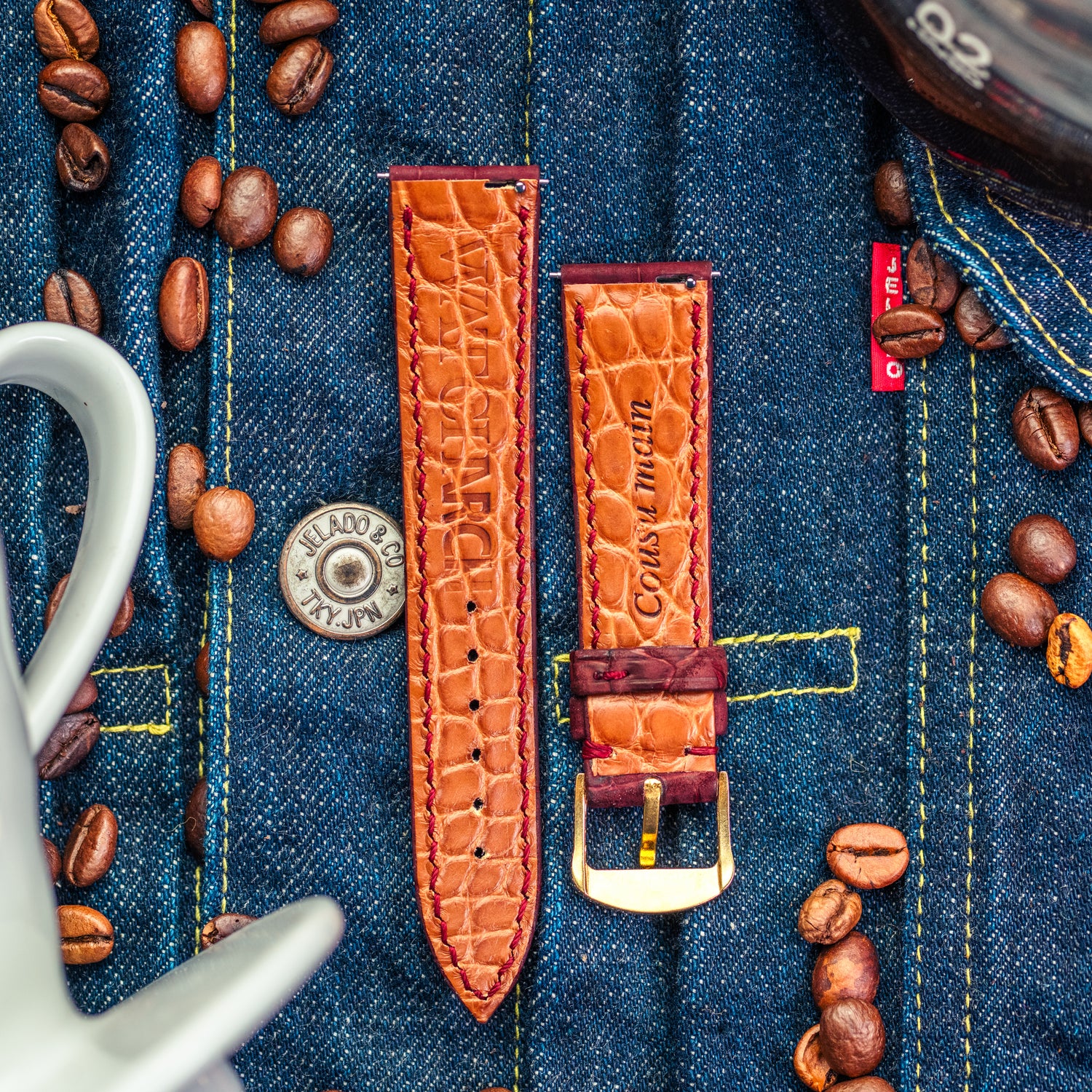 Un jeux de couleur entre la doublure en flanc d'alligator brun golden ainsi que la partie supérieur du bracelet lie de vin.