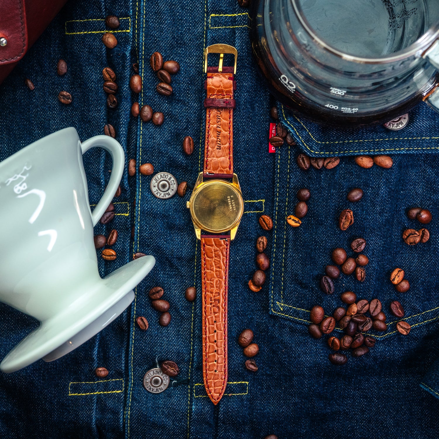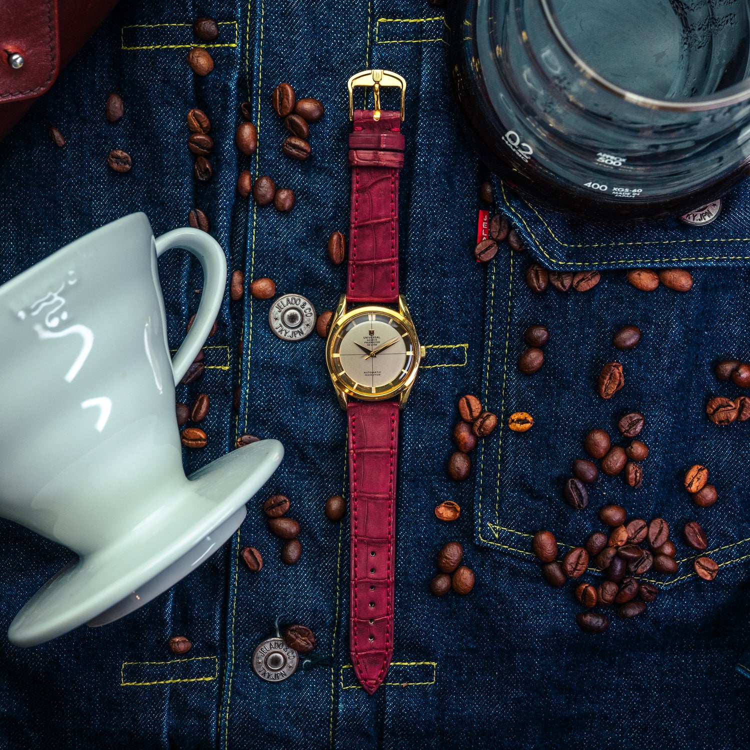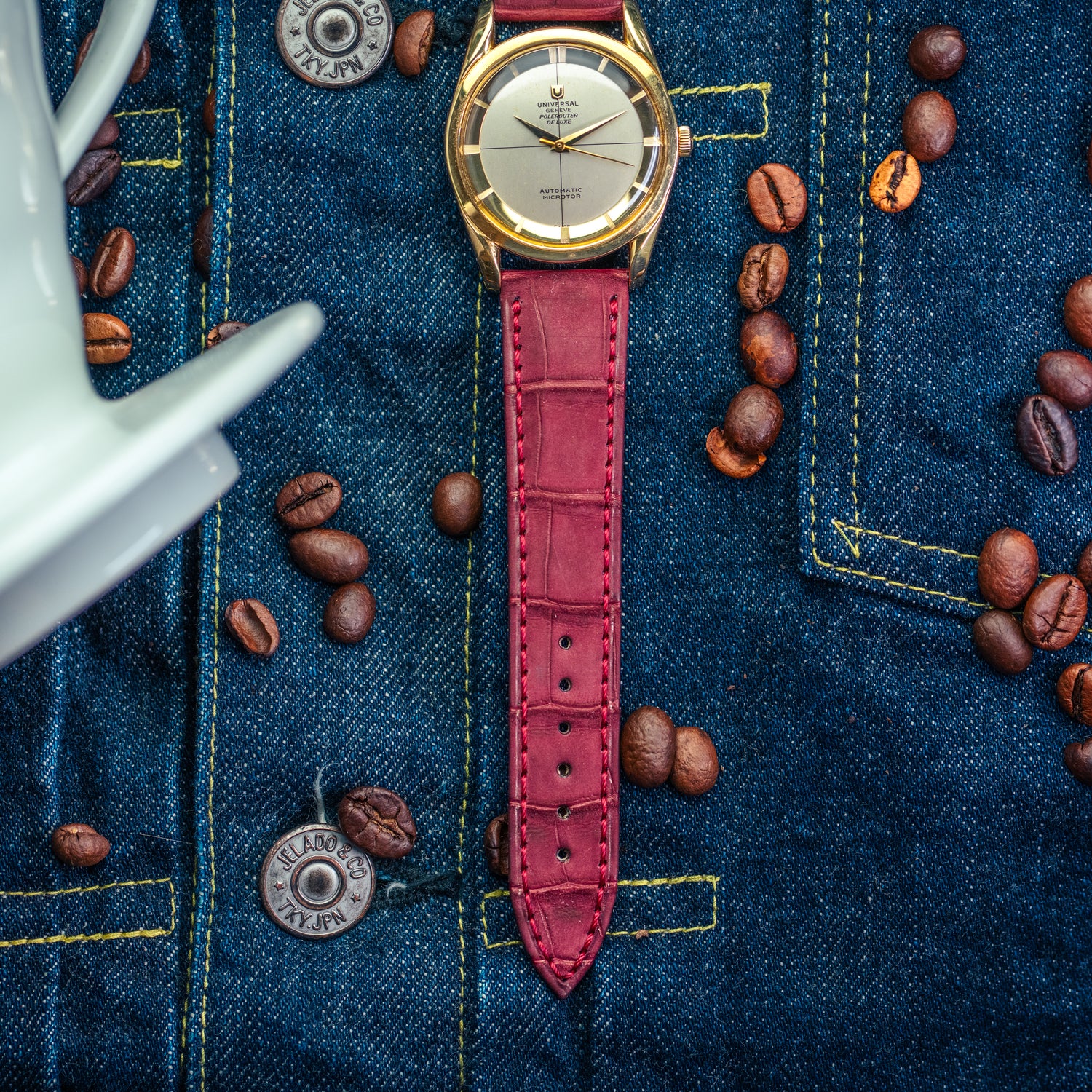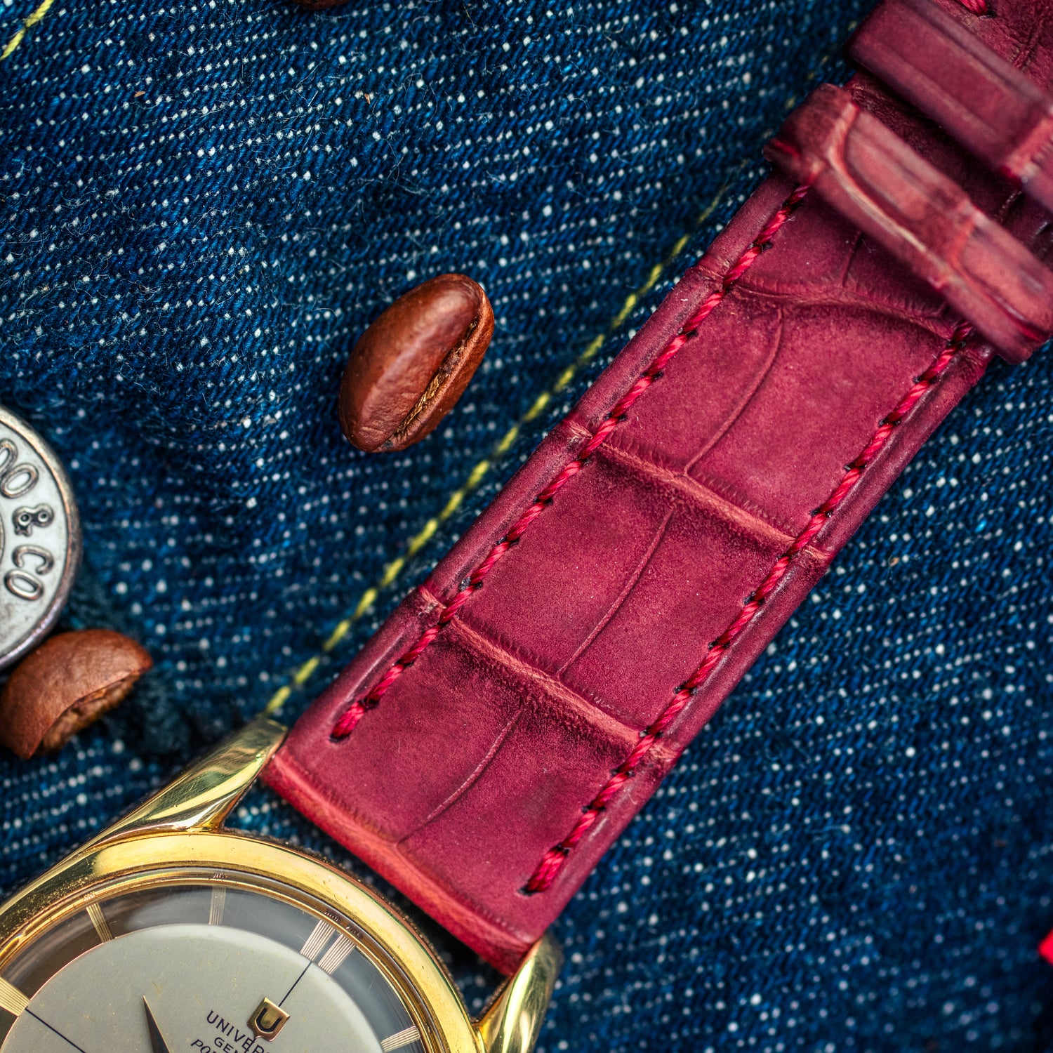 Un jeux de couleur entre la doublure en flanc d'alligator brun golden ainsi que la partie supérieur du bracelet lie de vin.