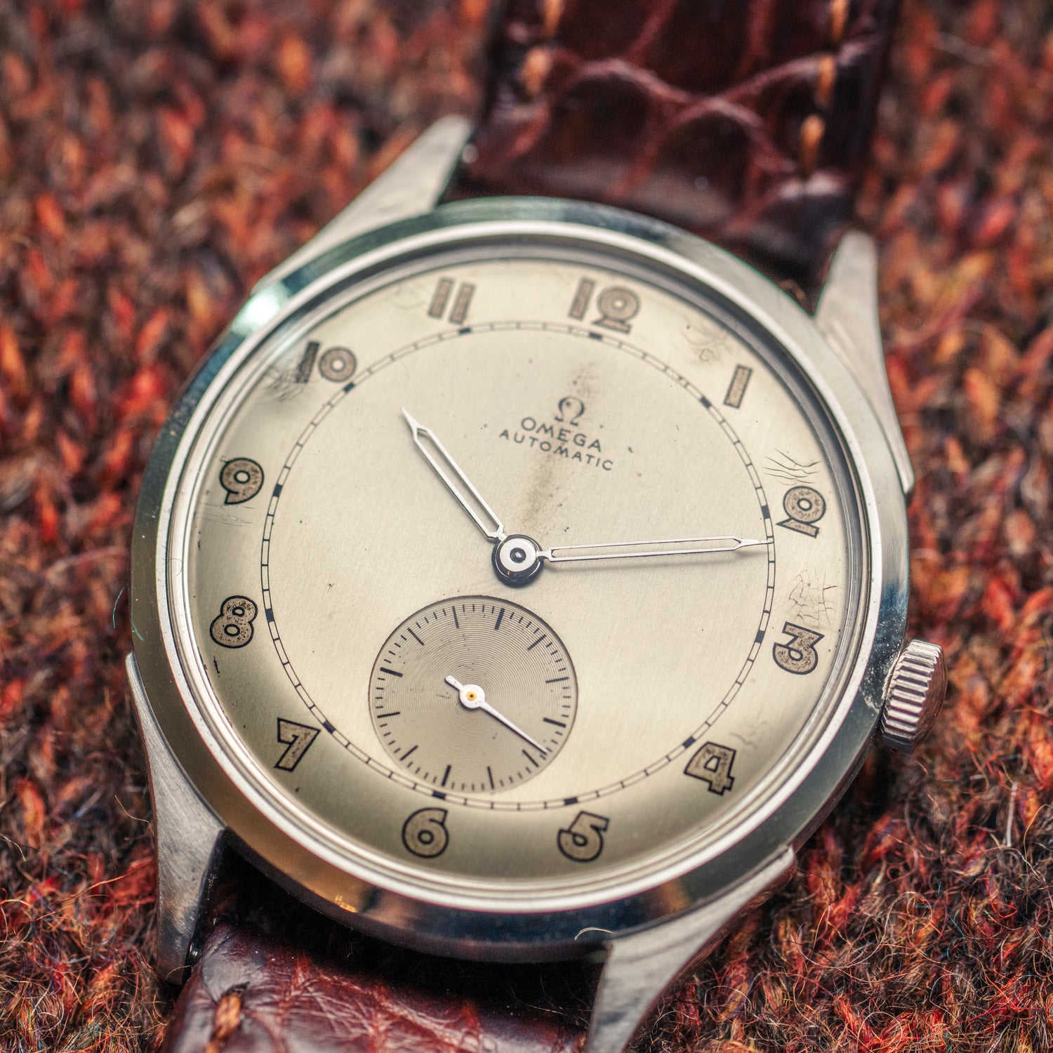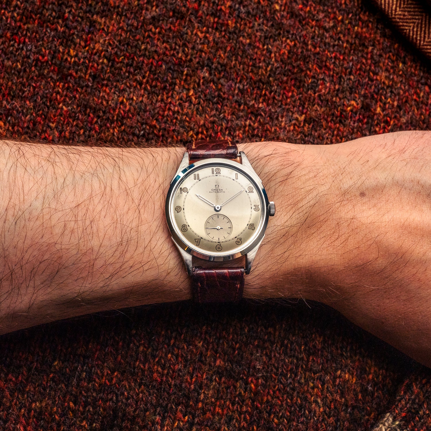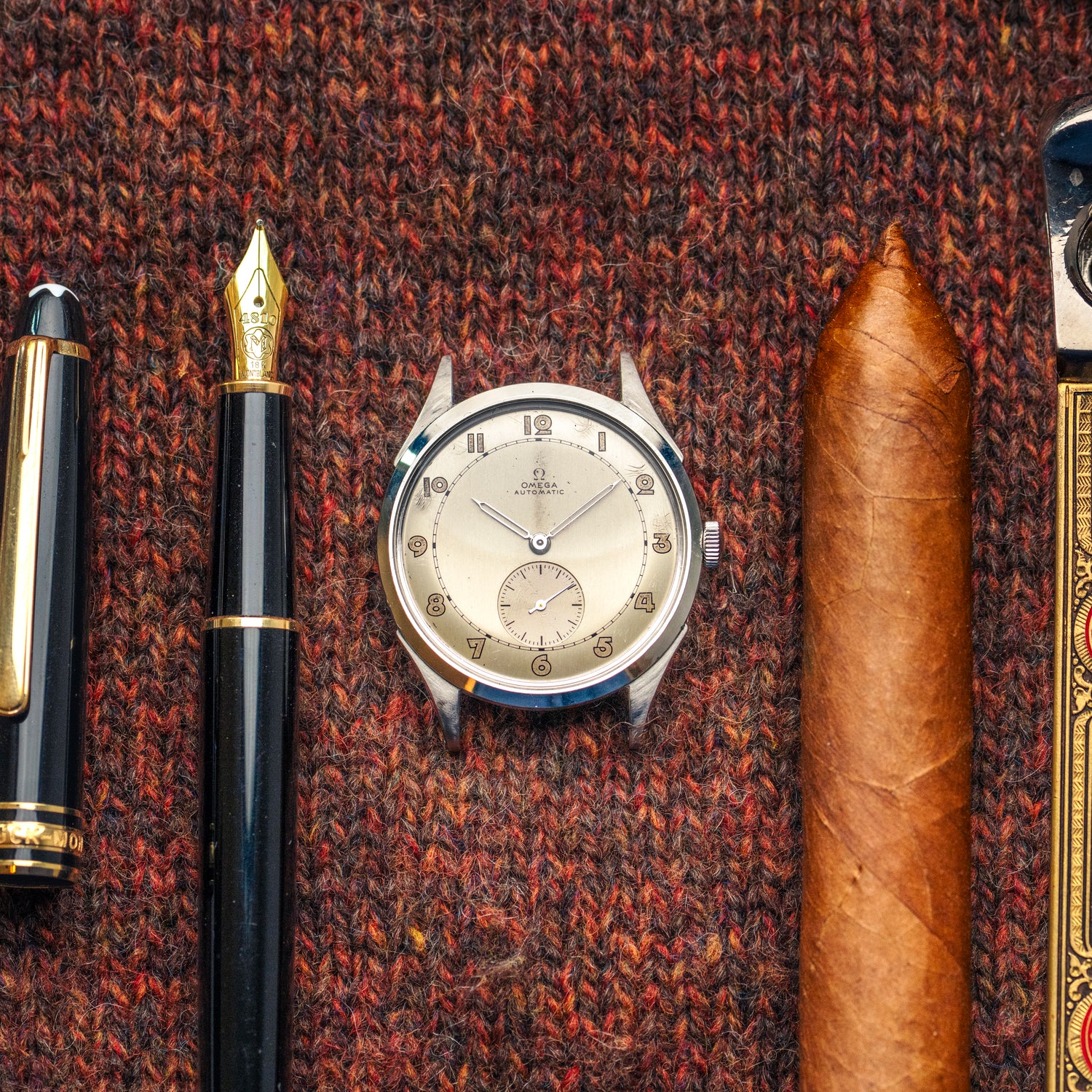 Une Omega… mais pas n’importe quelle Omega. Cette Sub Second Railroad des années 40 incarne l’élégance fonctionnelle des garde-temps de l’époque, avec son cadran subtilement patiné et sa petite seconde à six heures, typique des montres de précision destinées au personnes qui travaillaient sur les chemins de fer.