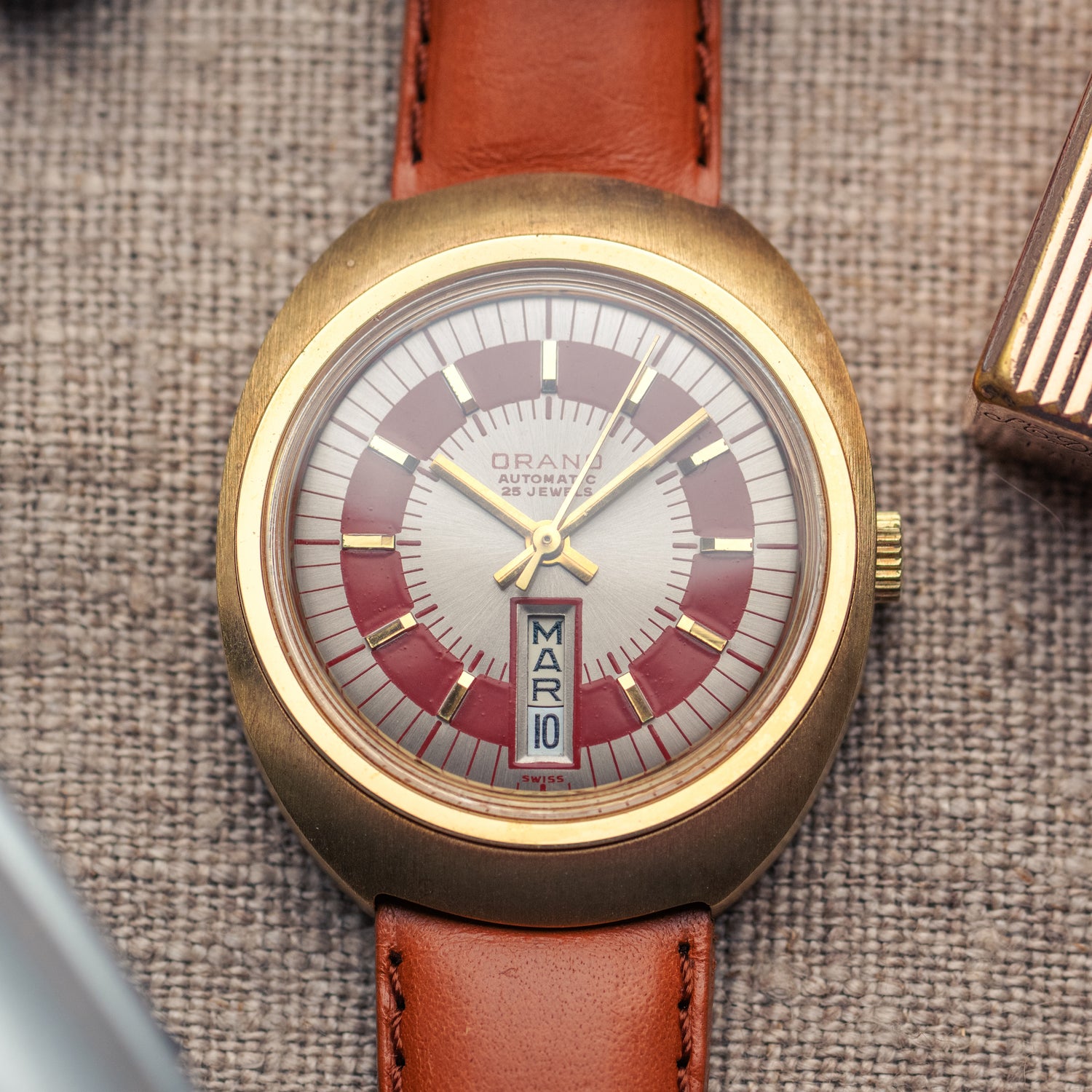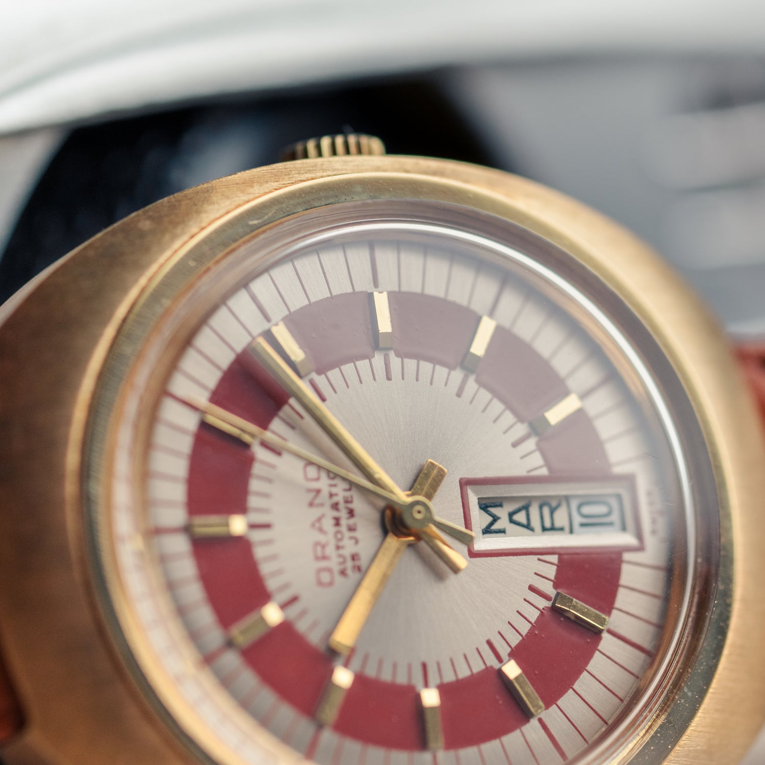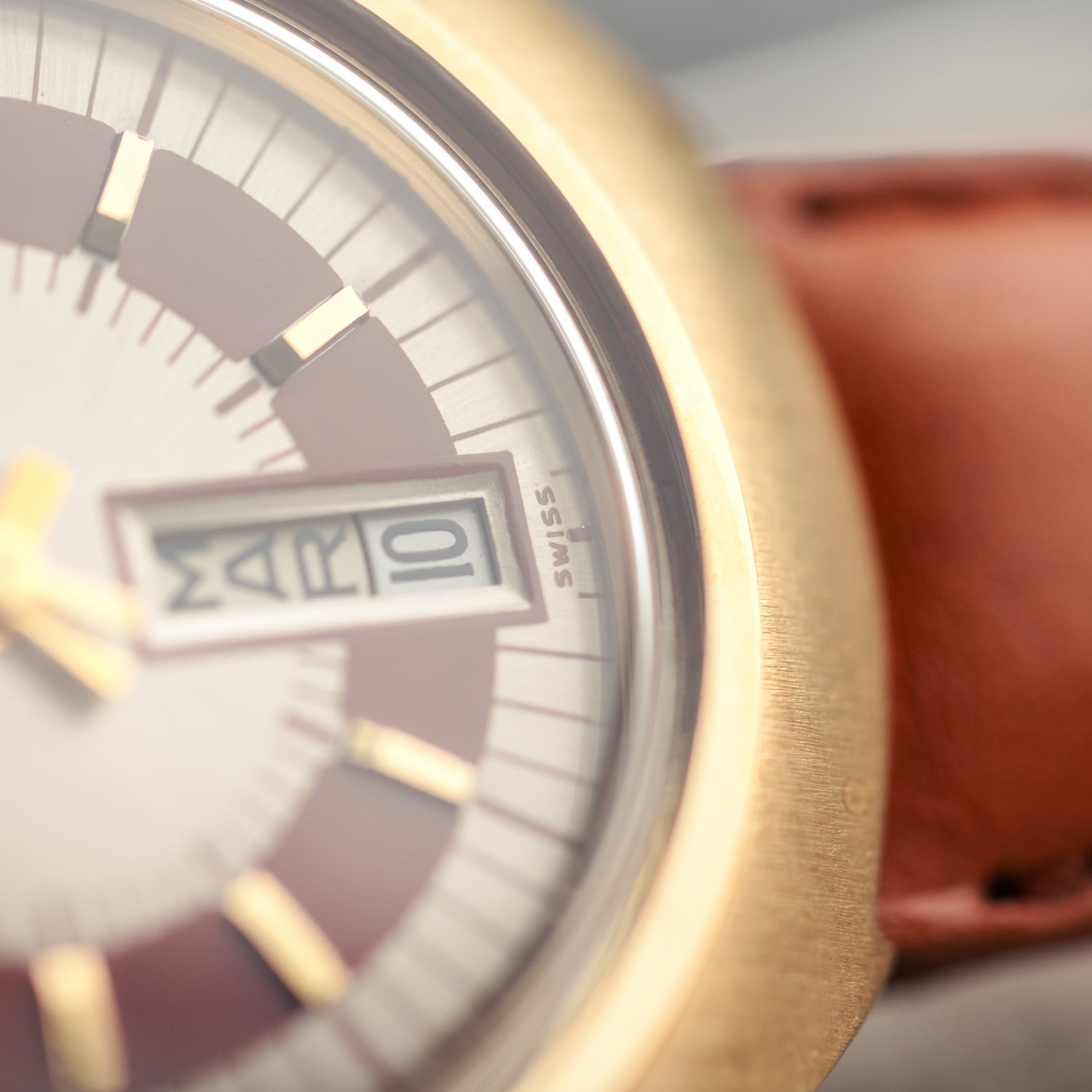 Un boîtier coussin plaqué or jaune, un cadran rouge sectorisé et la complication day/date... Que demander de plus, peut-être le détail qui fait que cette montre est une vraie pépite, son Swiss Made inscrit sur son cadran !