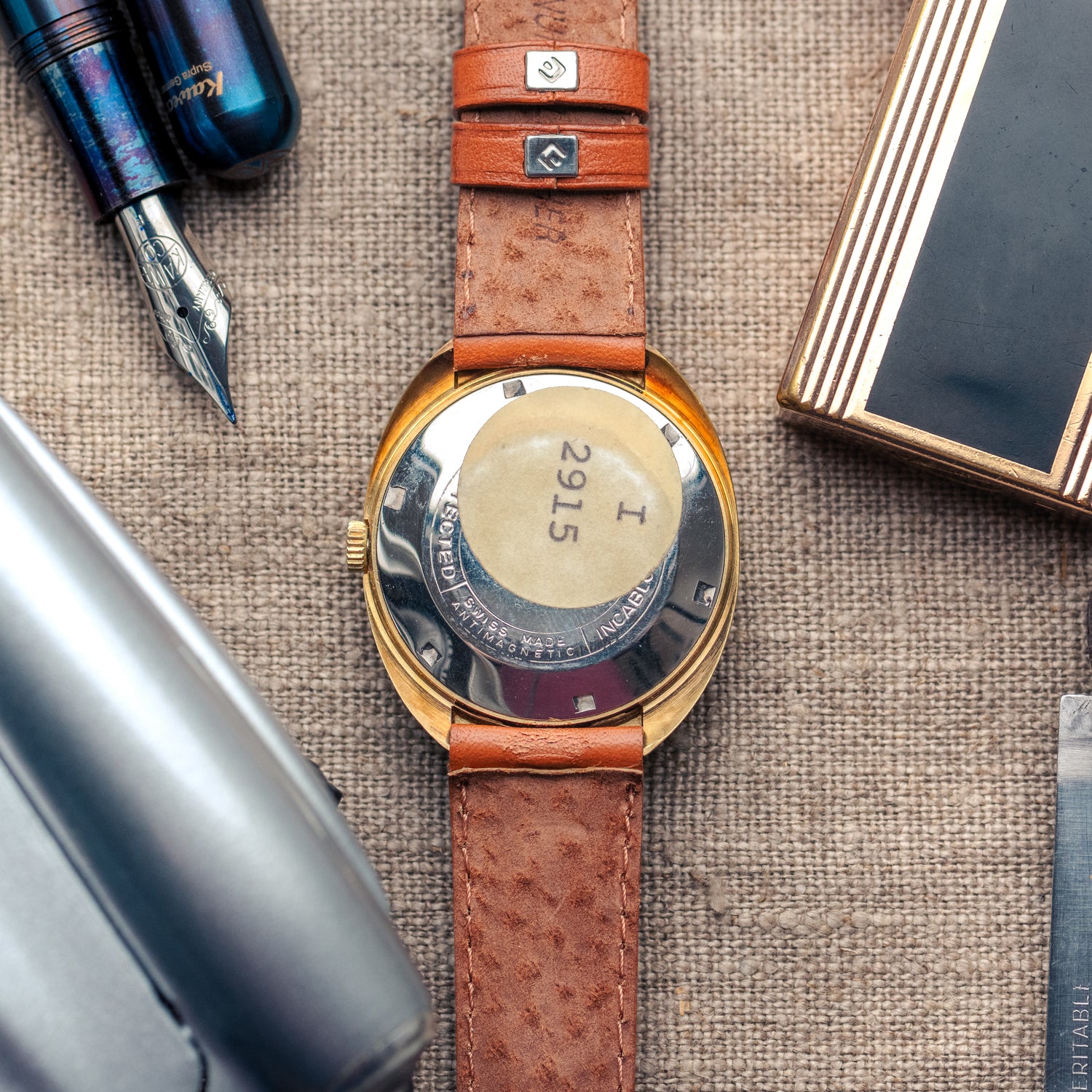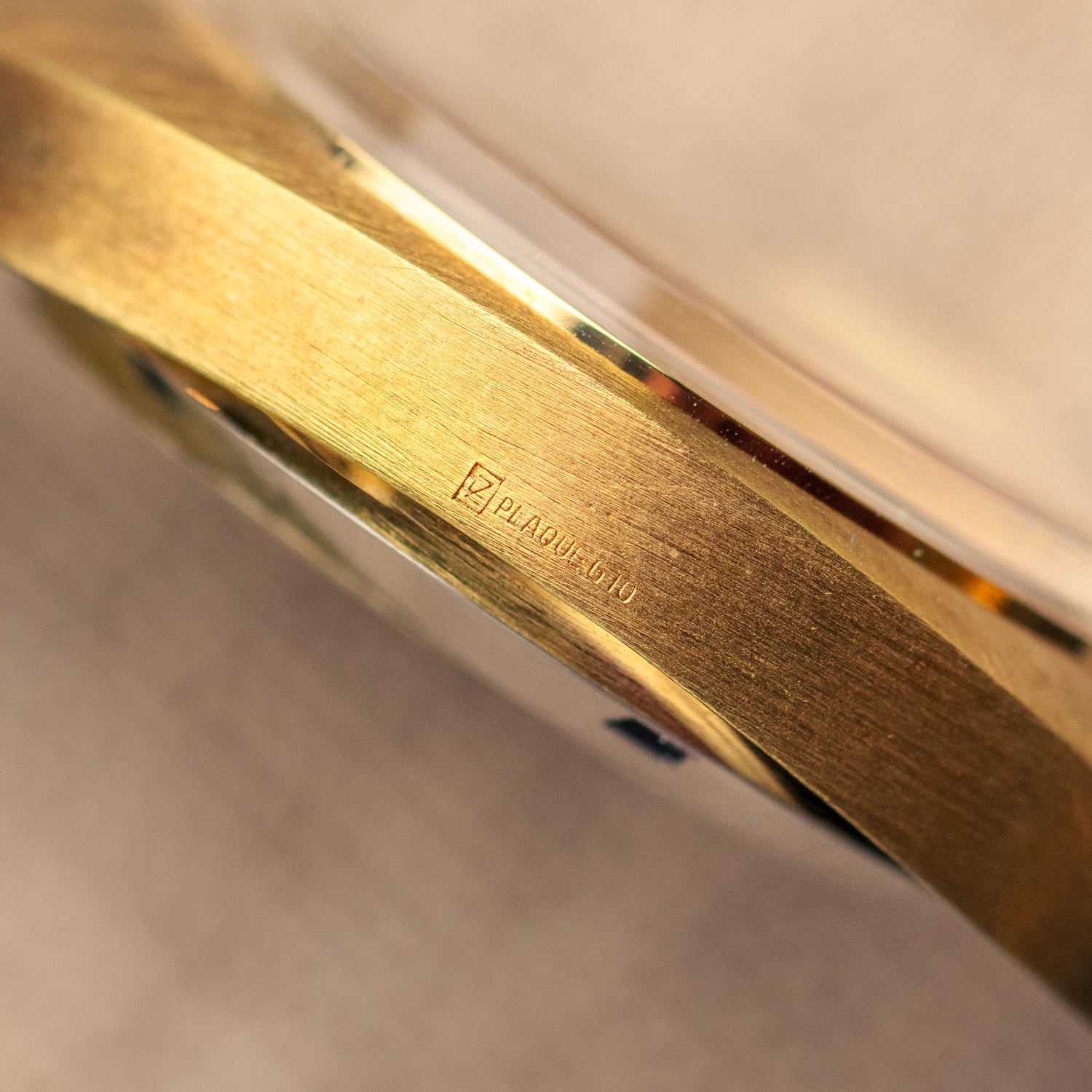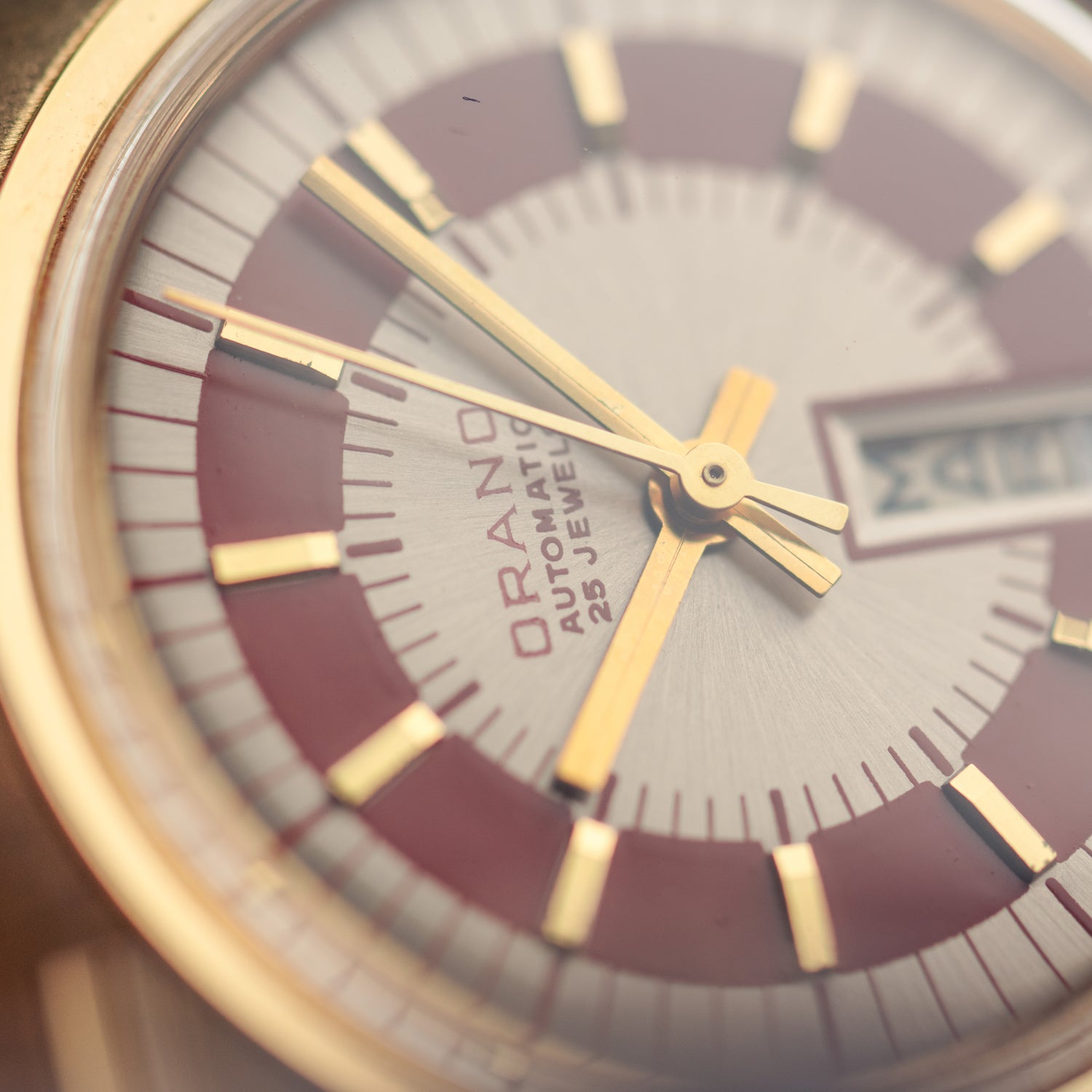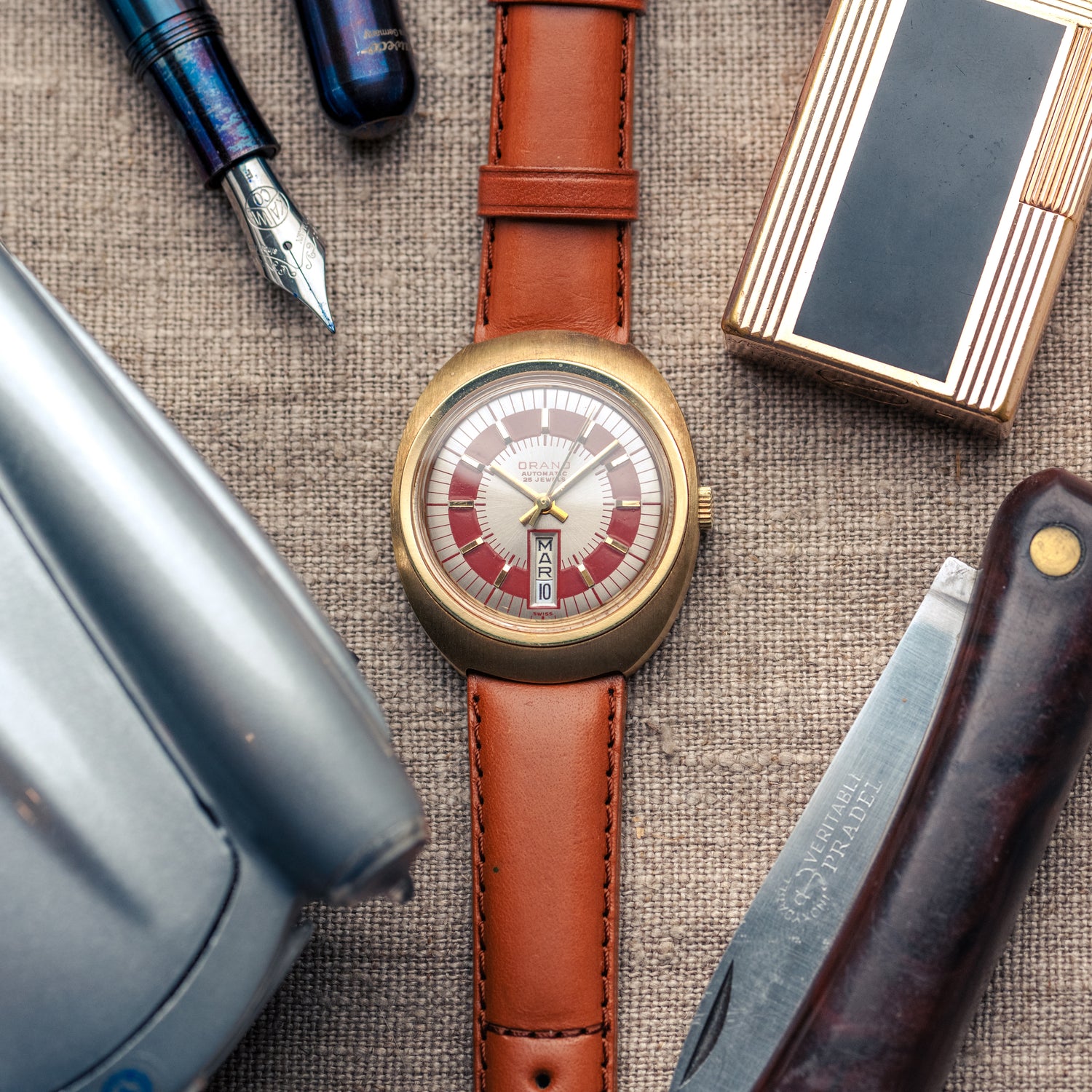 Un boîtier coussin plaqué or jaune, un cadran rouge sectorisé et la complication day/date... Que demander de plus, peut-être le détail qui fait que cette montre est une vraie pépite, son Swiss Made inscrit sur son cadran !
