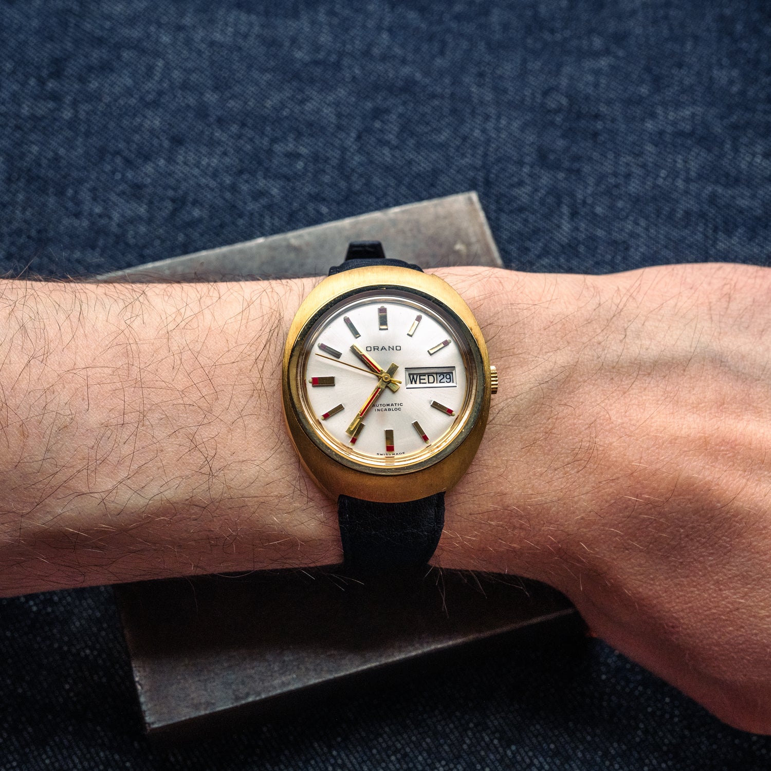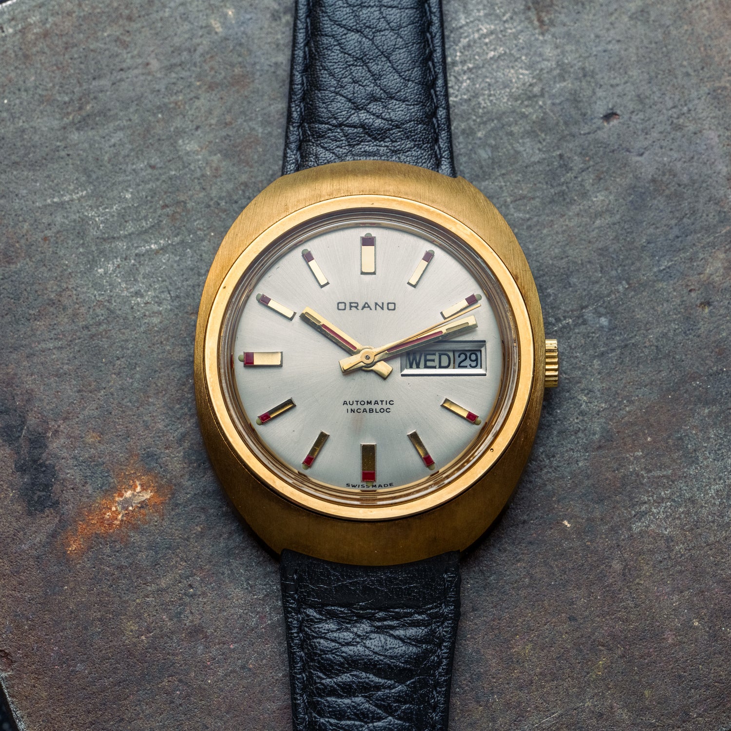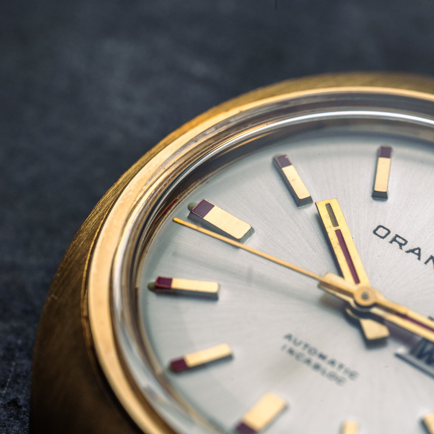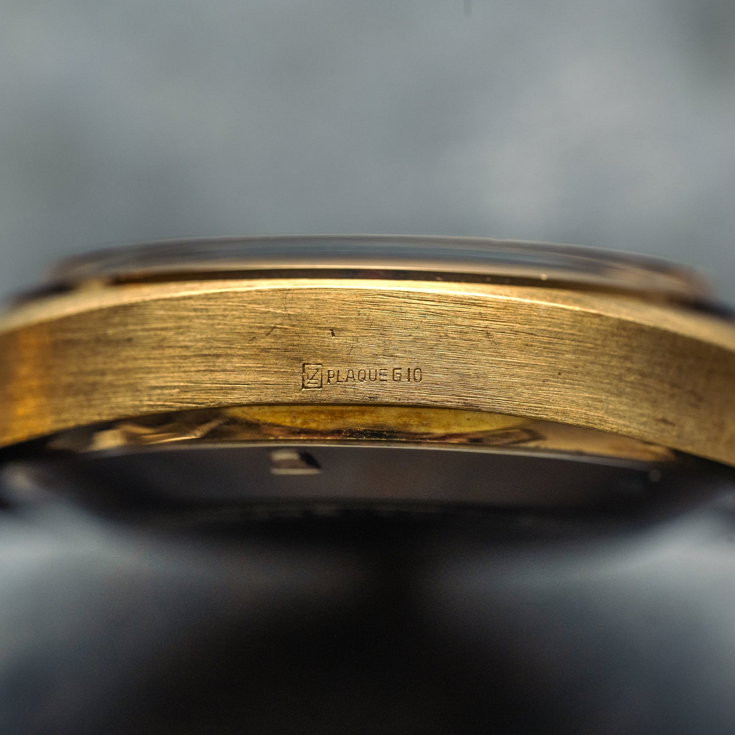 Un boîtier tonneau plaqué or jaune, un cadran sunburst silver et la complication day/date... Que demander de plus, peut-être le détail qui fait que cette montre est une vraie pépite, son Swiss Made inscrit sur son cadran !