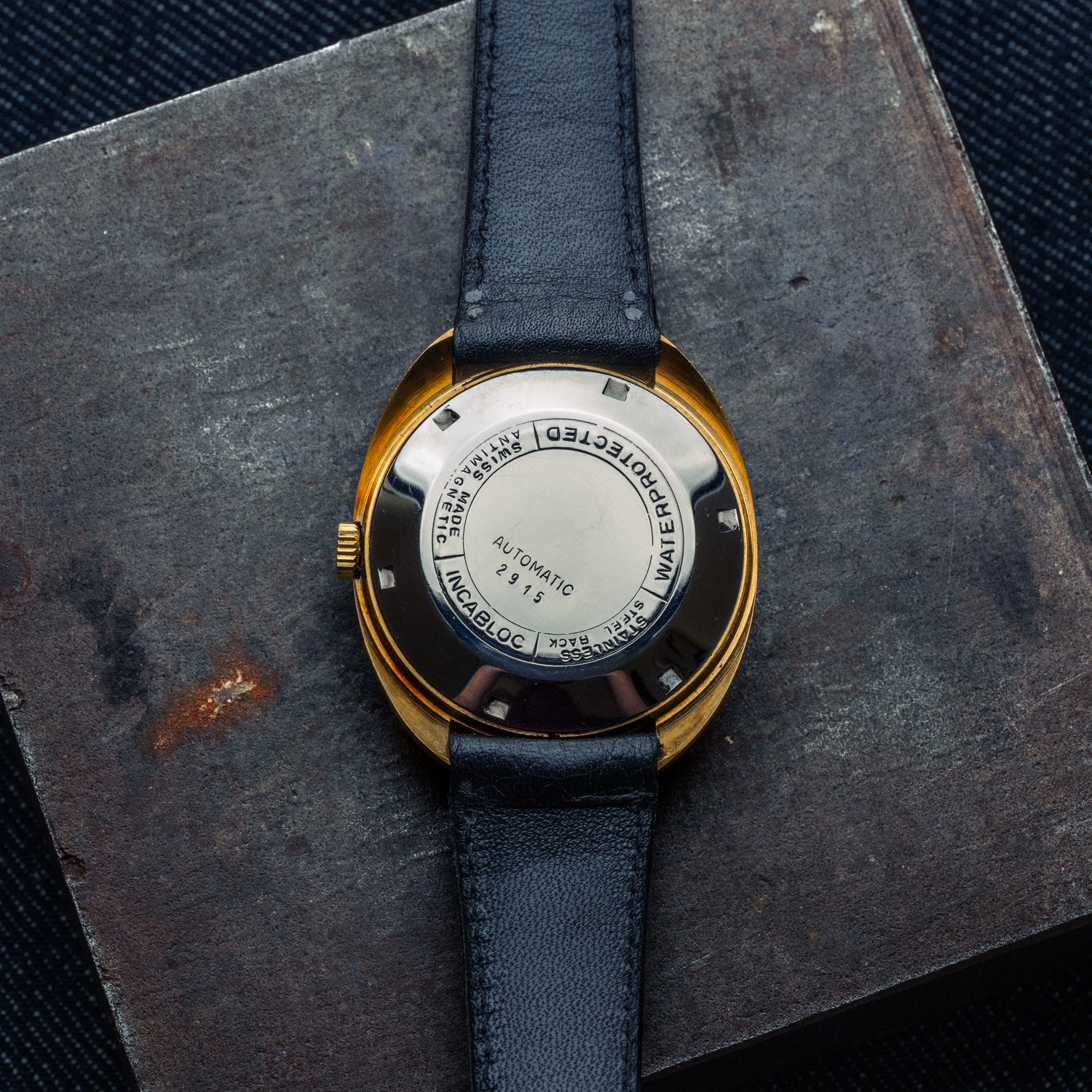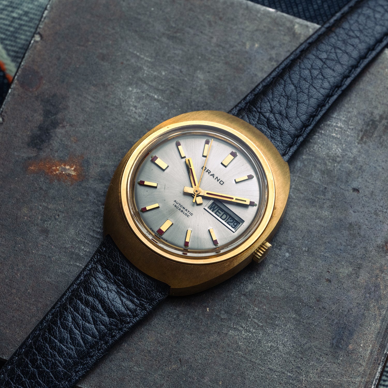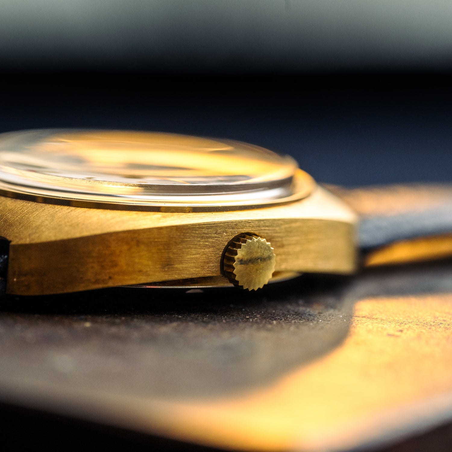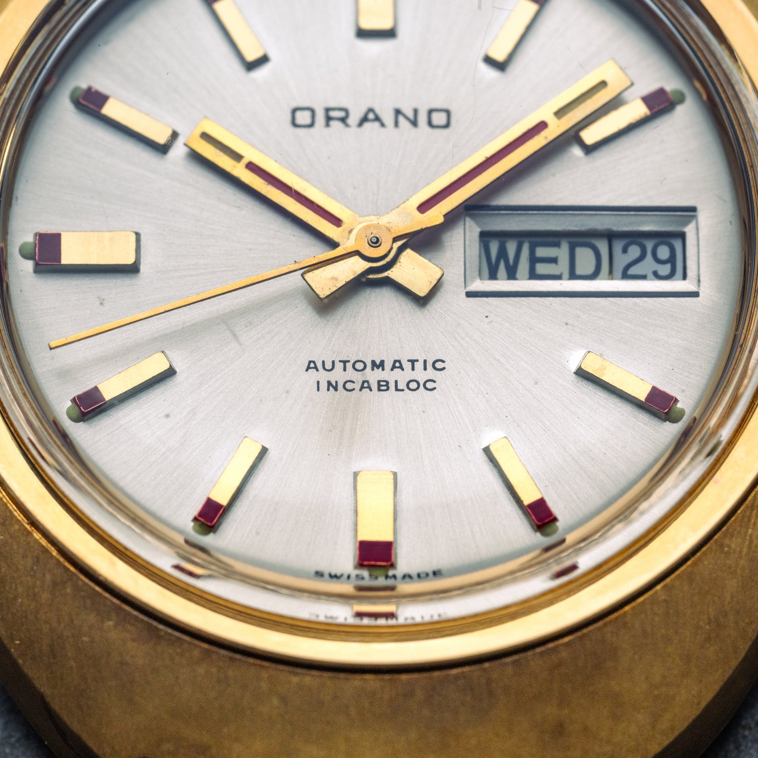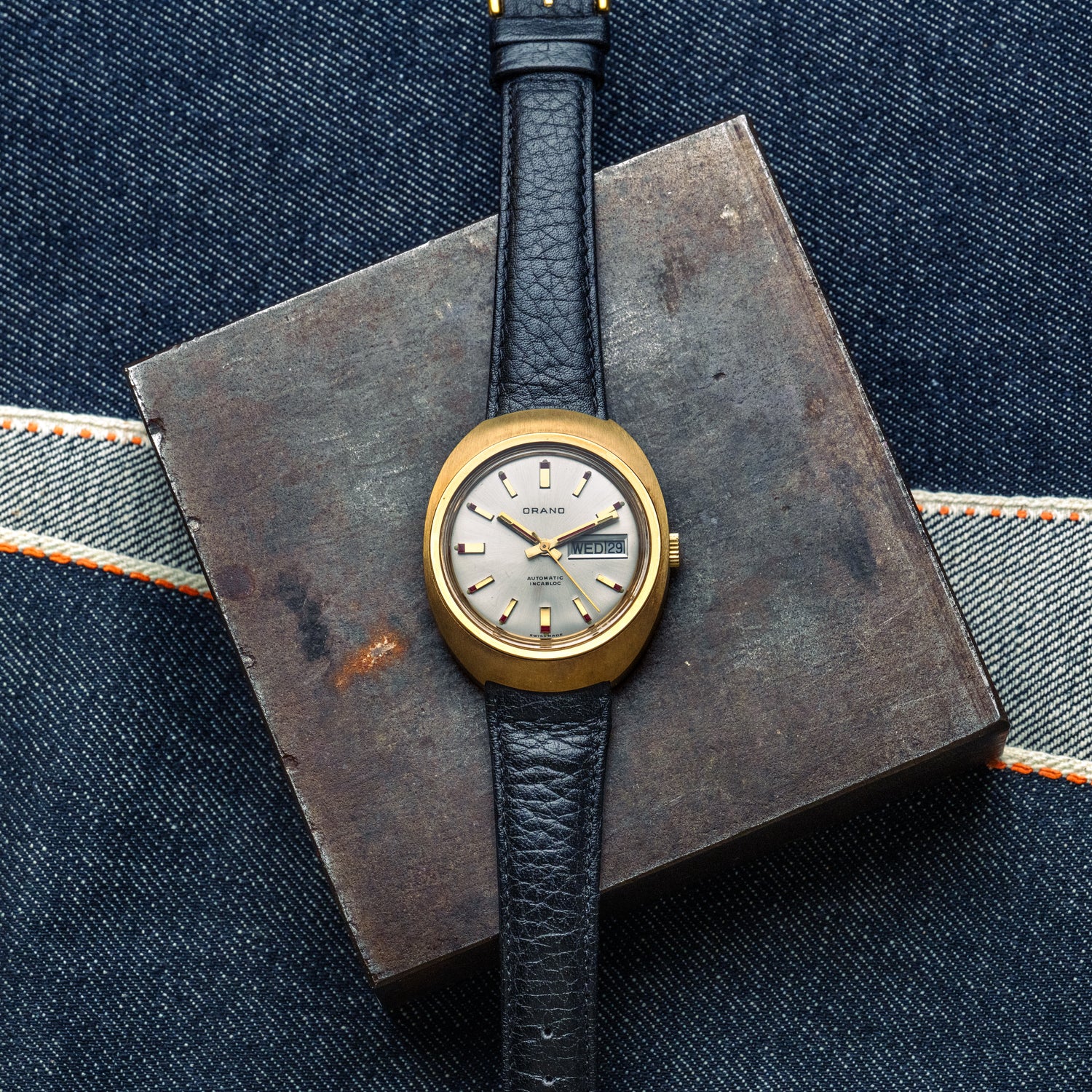 Un boîtier tonneau plaqué or jaune, un cadran sunburst silver et la complication day/date... Que demander de plus, peut-être le détail qui fait que cette montre est une vraie pépite, son Swiss Made inscrit sur son cadran !