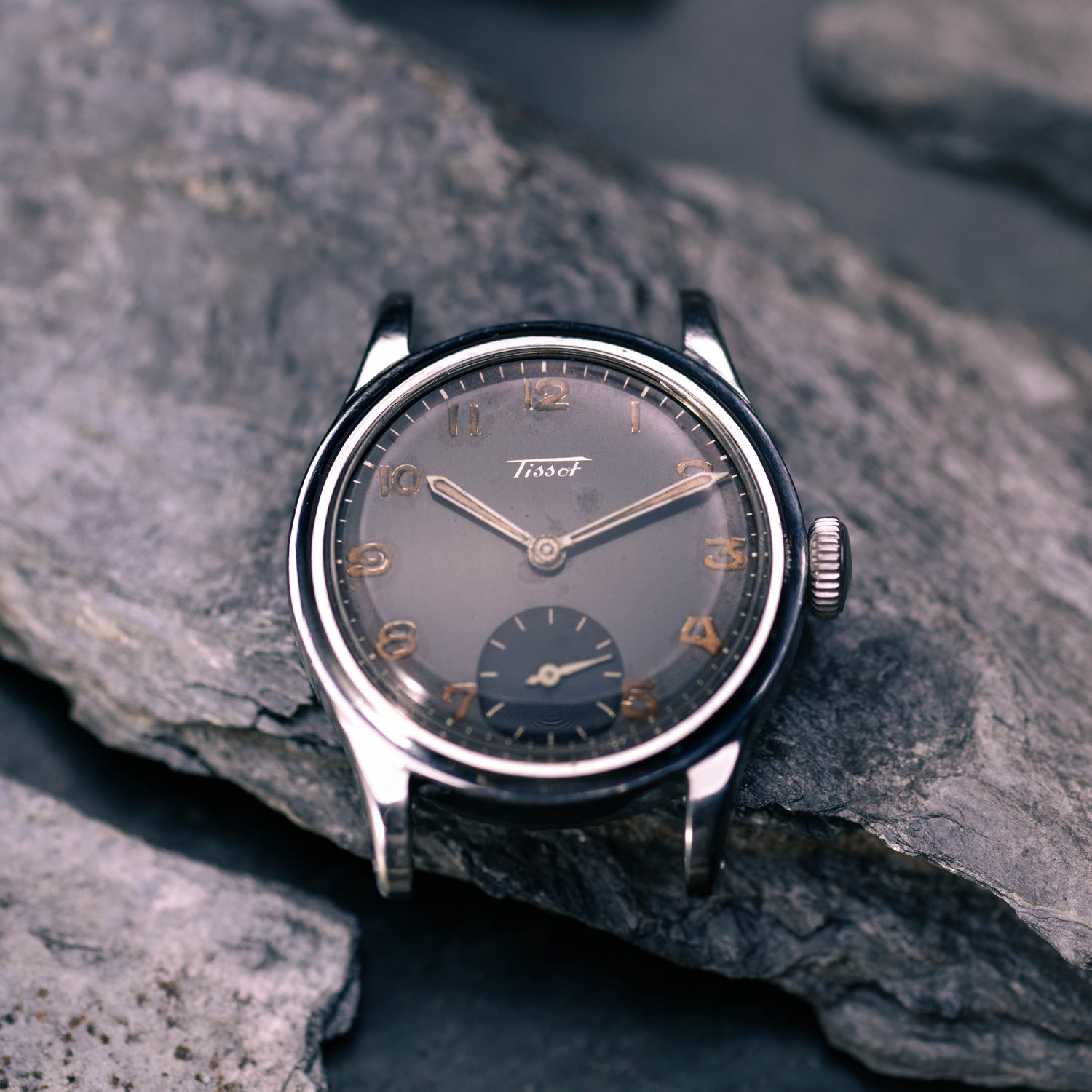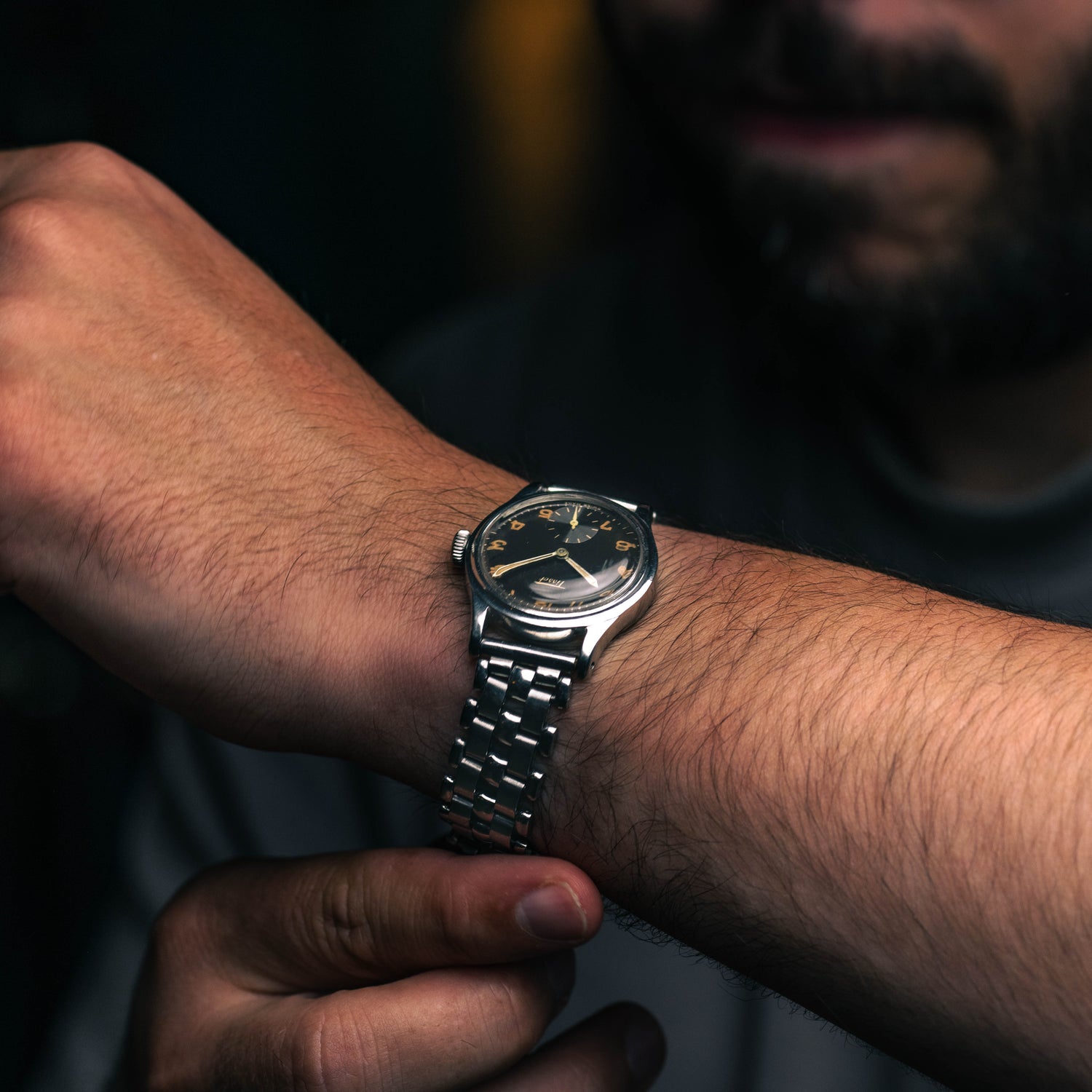 Petite seconde à six heure, cadran noir avec les indexes en chiffre arabe, il n'y a pas de doute, voici une montre tout droit sortie d'un livre d'histoire retraçant le passé de l'horlogerie à dotation militaire.