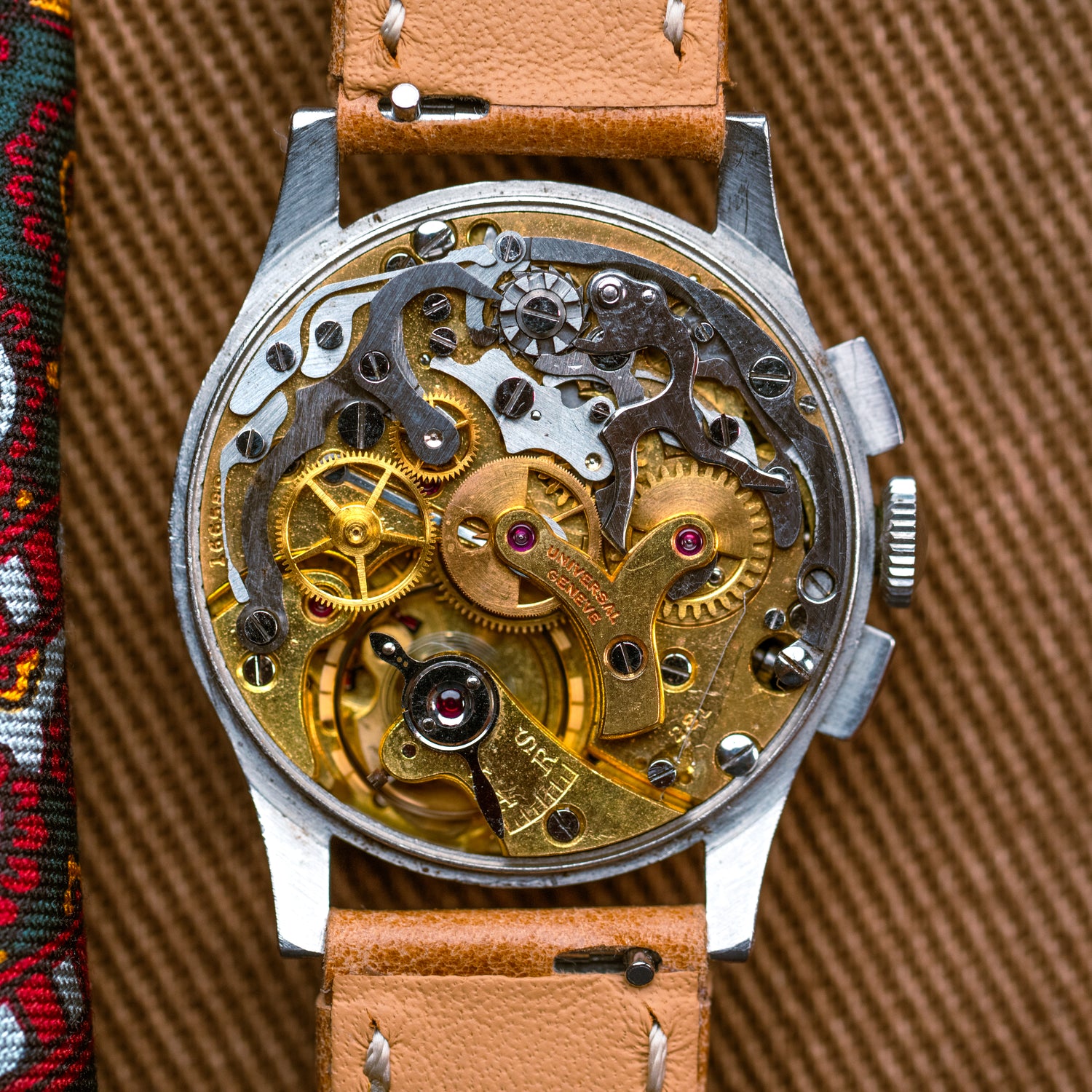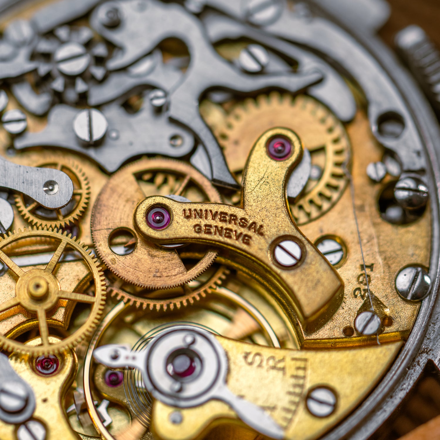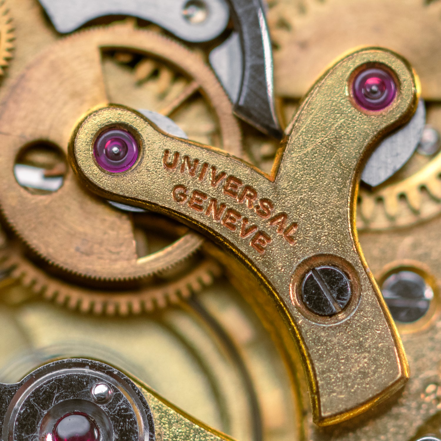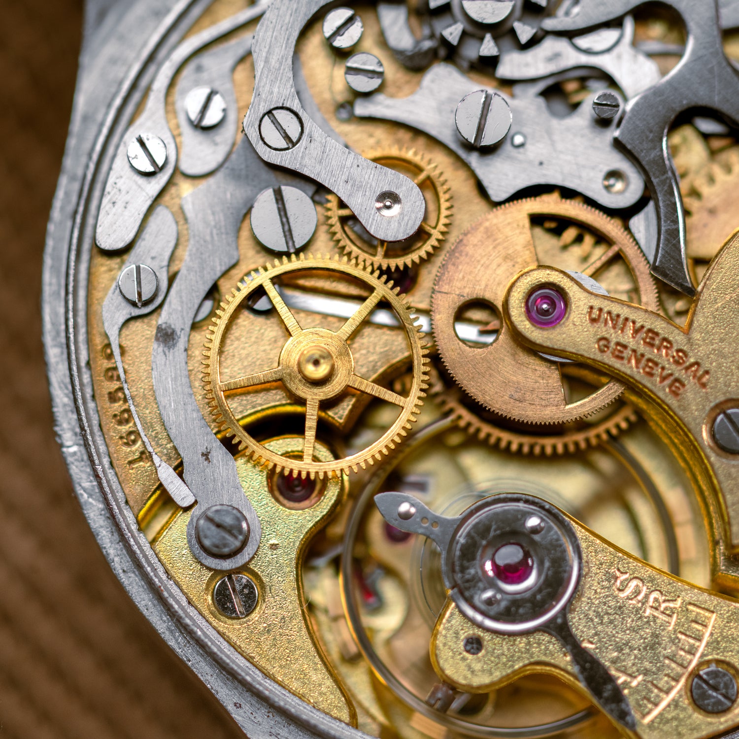 • Calibre chronographe Universal Genève à remontage manuel avec roue à colonne