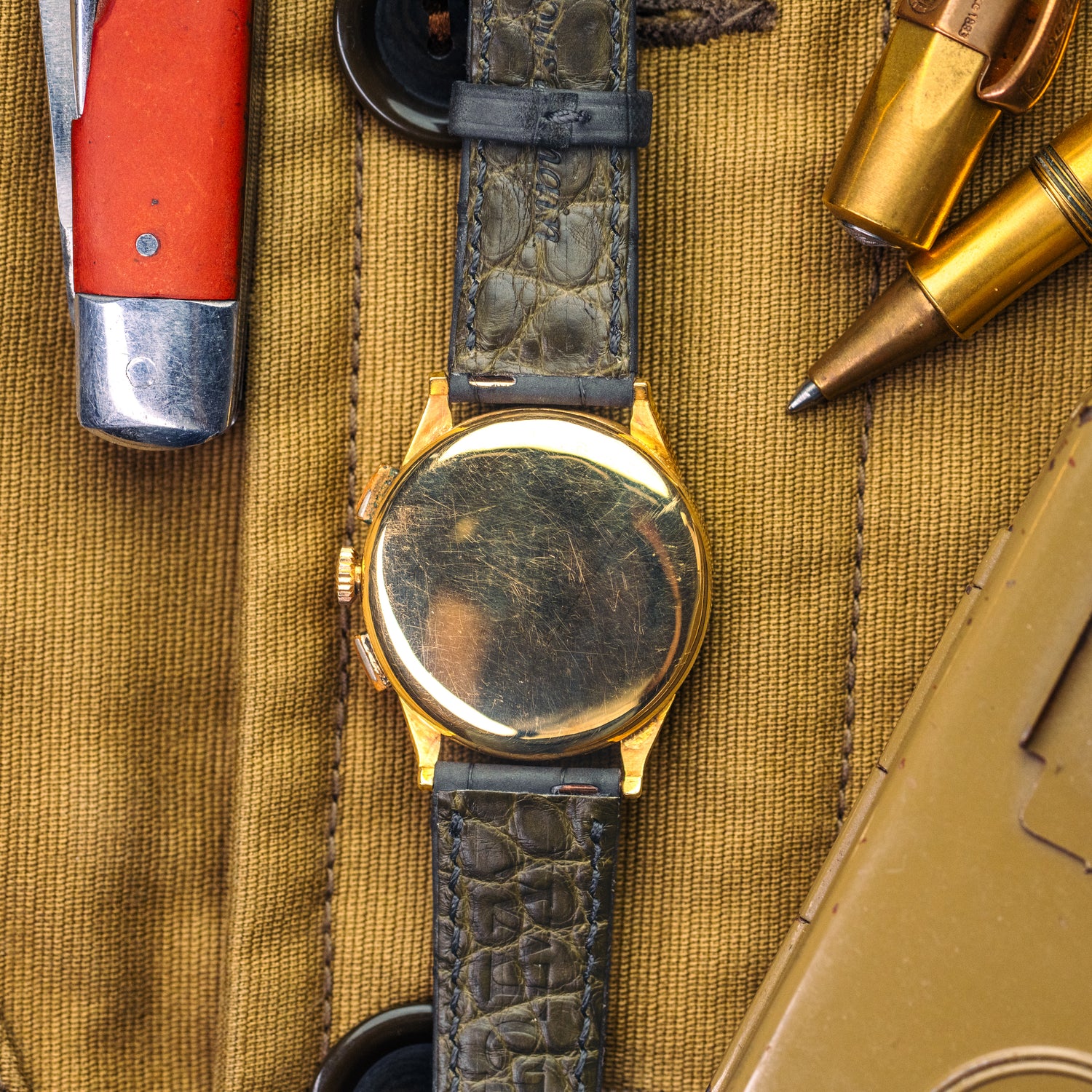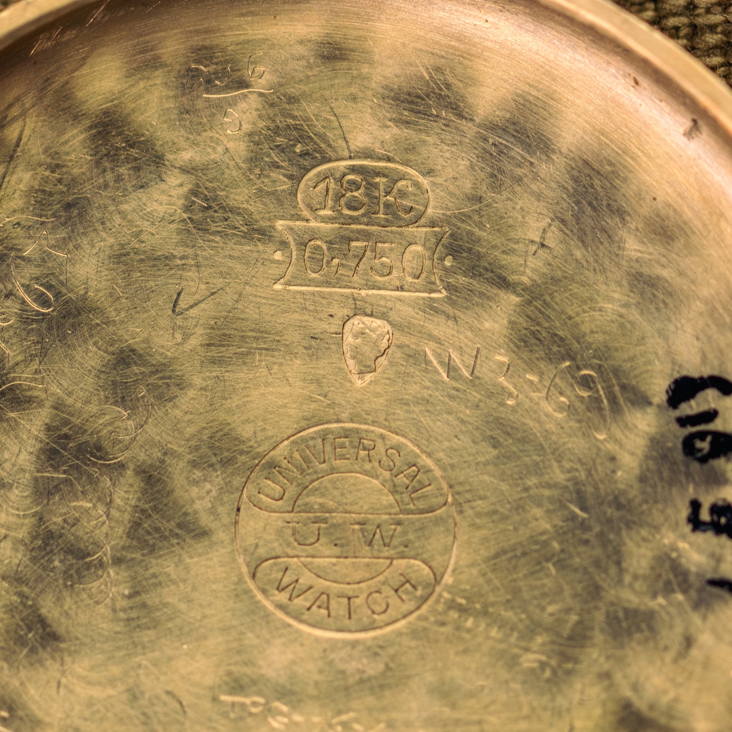 Et le truc en plus qui fait que ce n'est pas n'importe quelle Universal Genève, c'est son boîtier. Car il a été réalisé par Henri Jeanneret au Locle en Suisse. On peut l'attester grâce à son poinçon en forme de tête de marteau avec le numéro 166 et surtout le design typique des cornes en forme que l'on a baptisé "serre d'aigle" !