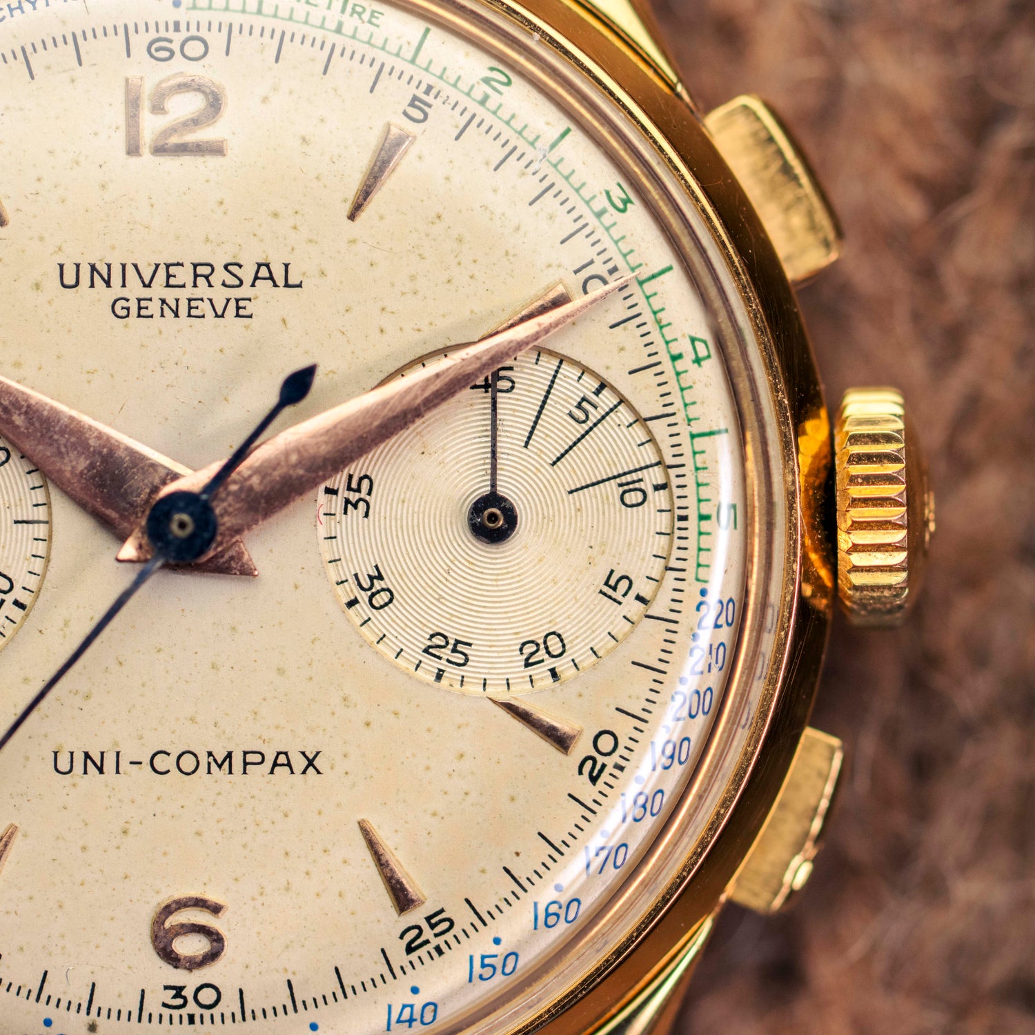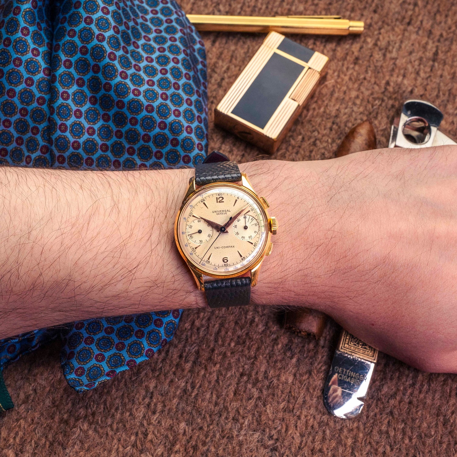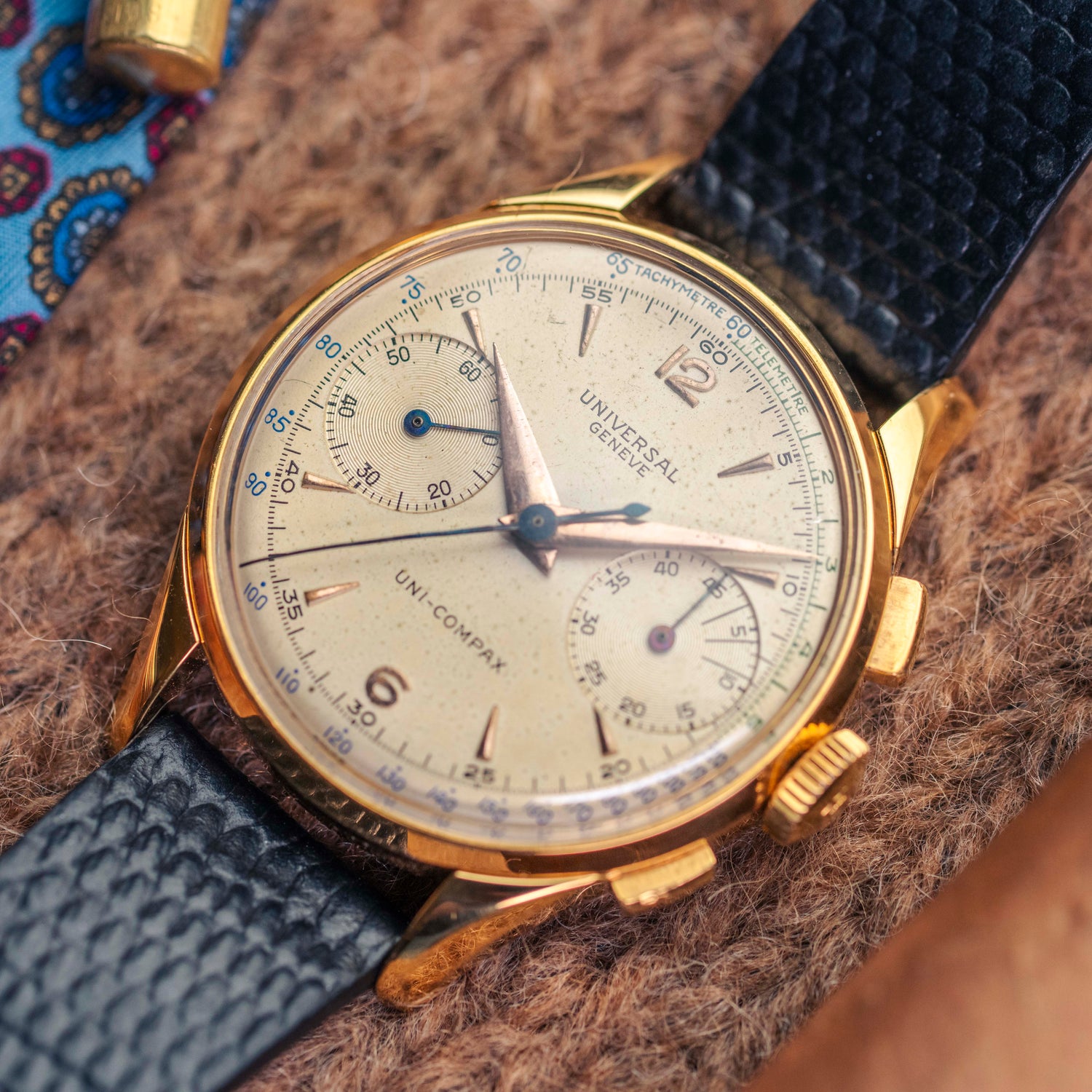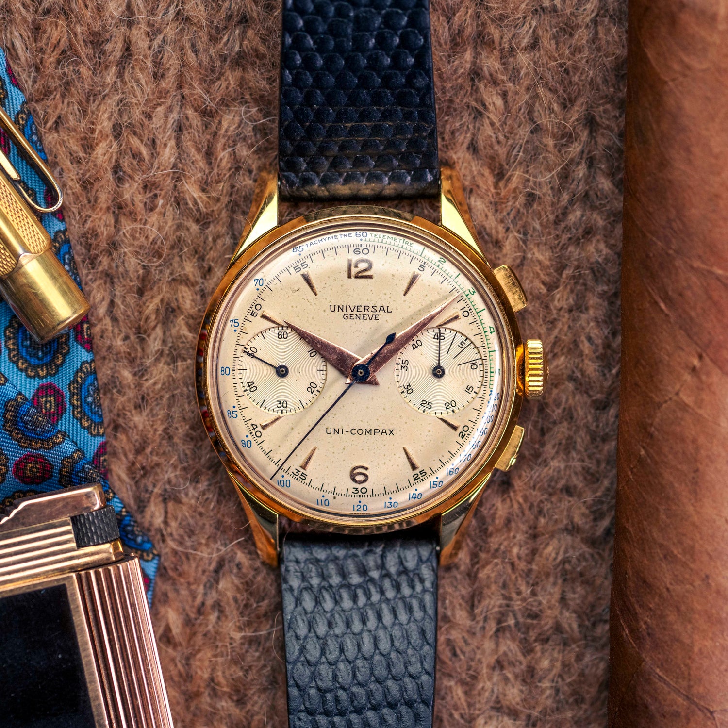 Il existe des chronographes qui résument à eux seuls tout ce que l’on aime dans l’horlogerie vintage. Cette Uni-Compax plaquée en or jaune et signée Universal Genève en fait clairement partie.