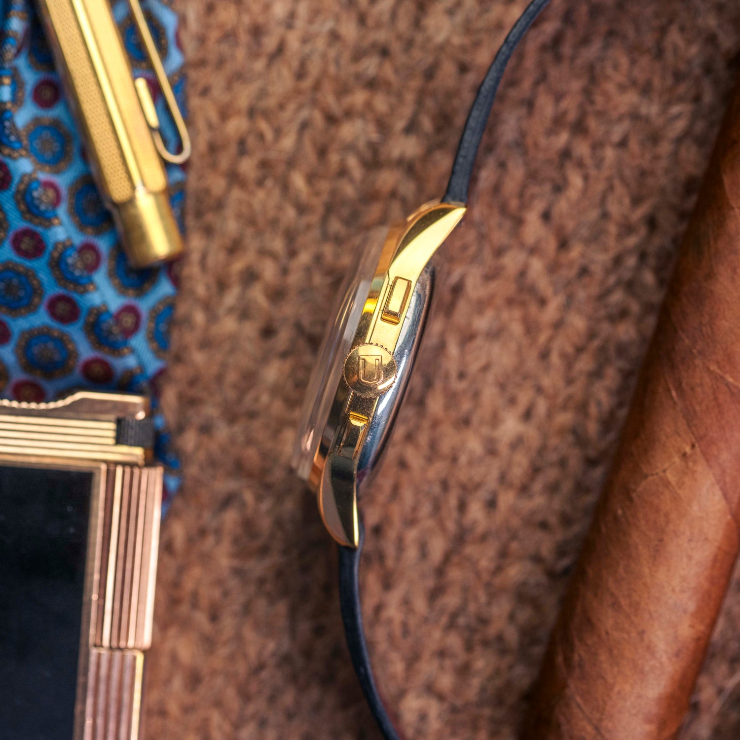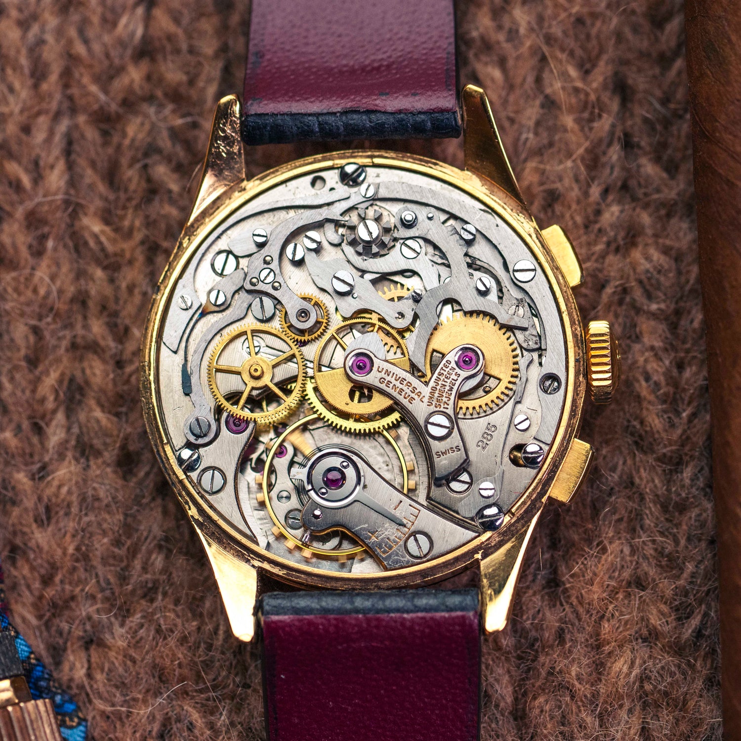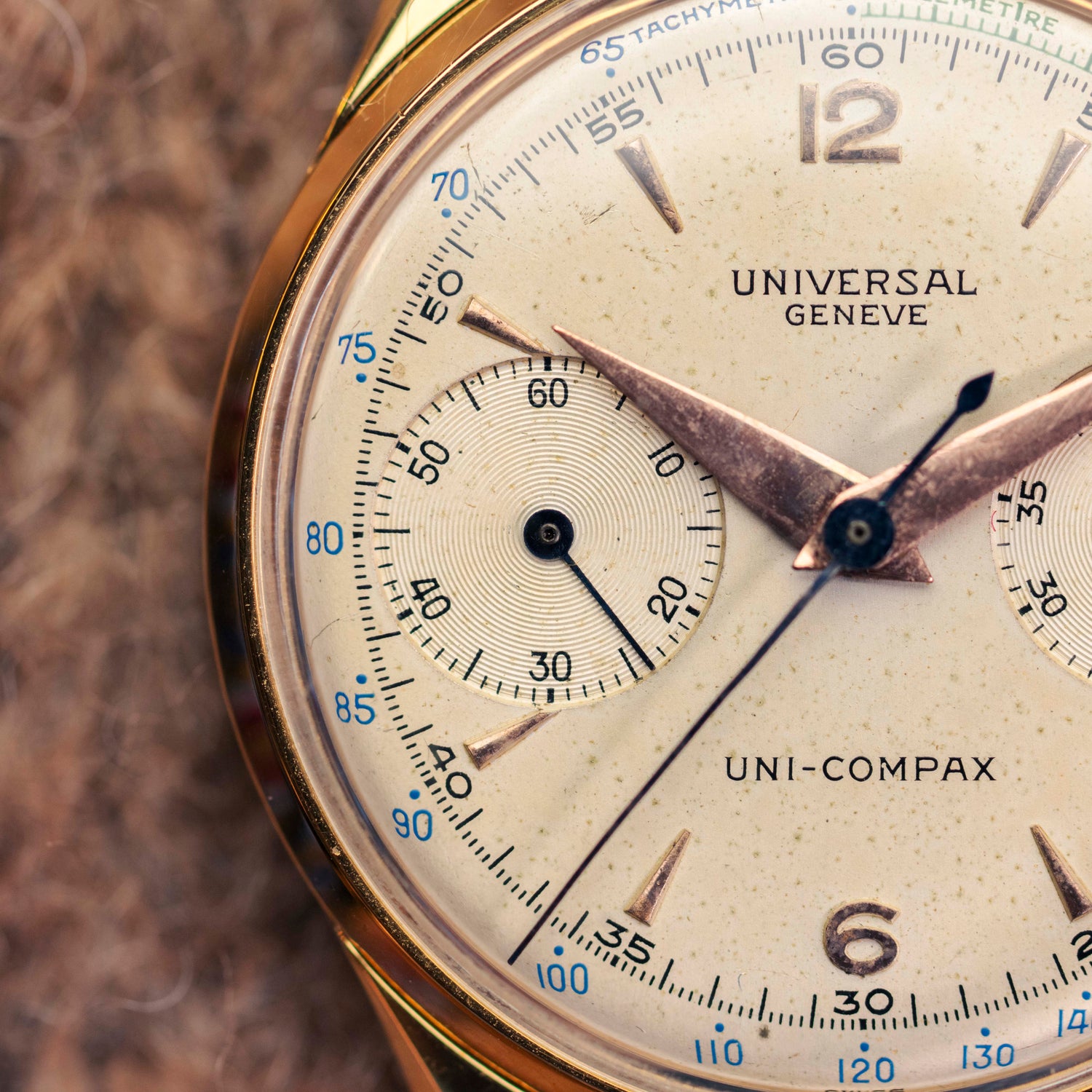 Il existe des chronographes qui résument à eux seuls tout ce que l’on aime dans l’horlogerie vintage. Cette Uni-Compax plaquée en or jaune et signée Universal Genève en fait clairement partie.