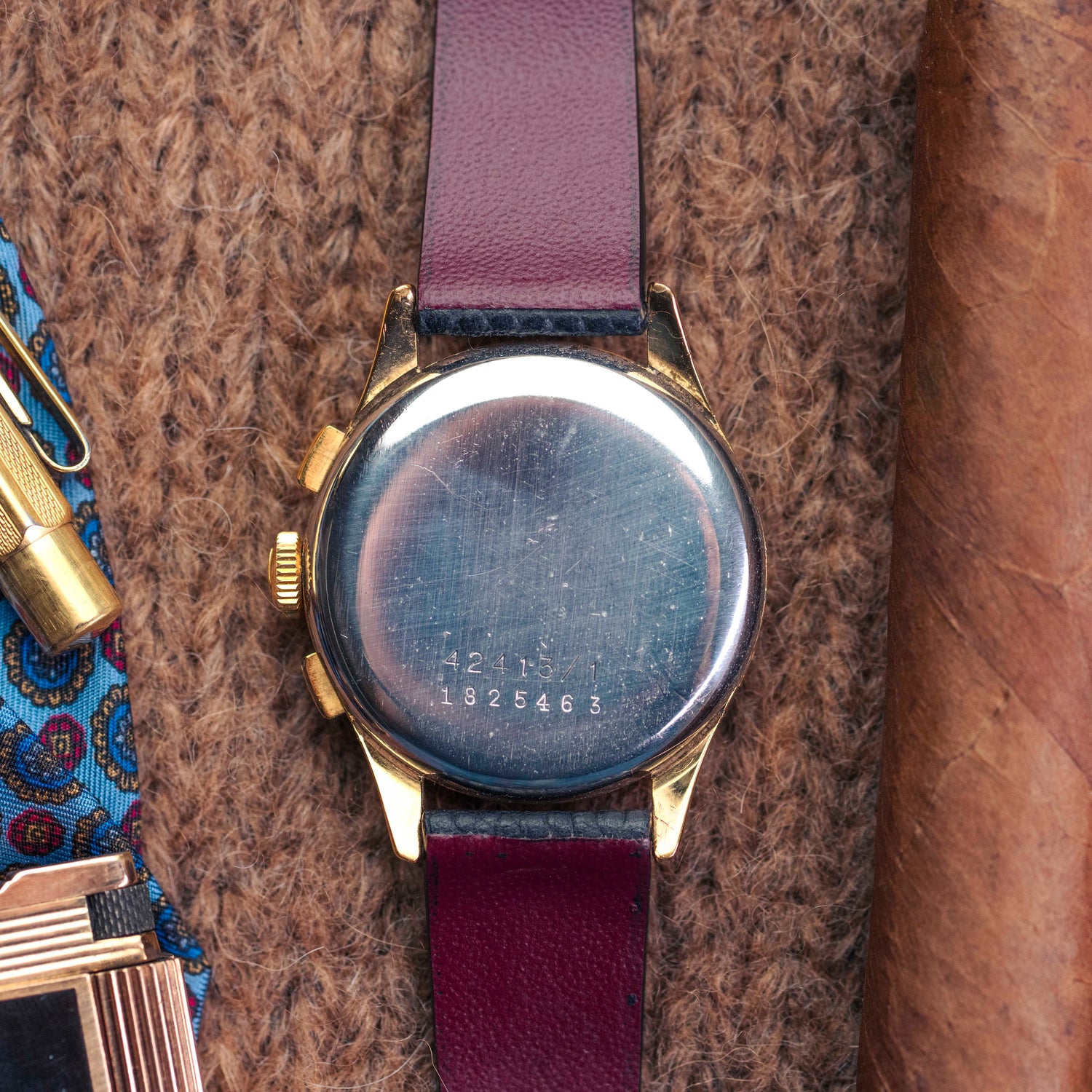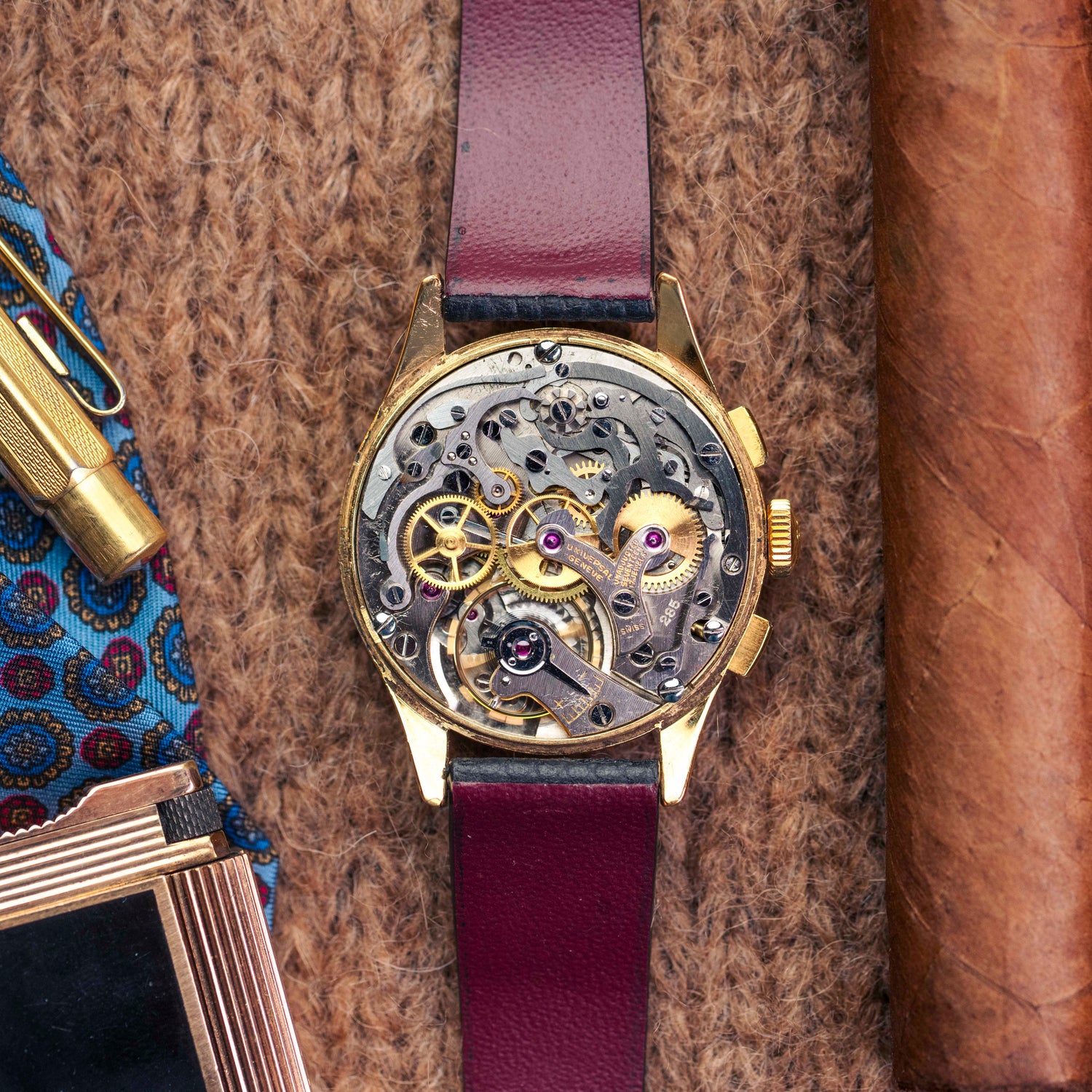 Le boîtier plaqué or conserve ses angles et son charme d’époque, tandis que les poussoirs pompe et le verre plexi rappellent immédiatement le design des tout premiers chronos de l’après-guerre. Le cadran, totalement d’origine, offre une patine chaleureuse et homogène qui donne à la montre une présence unique au poignet.
